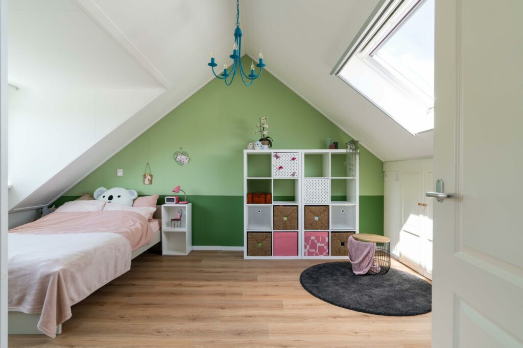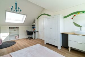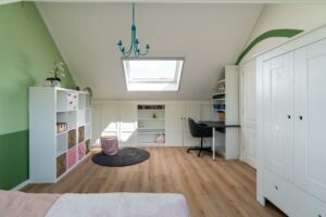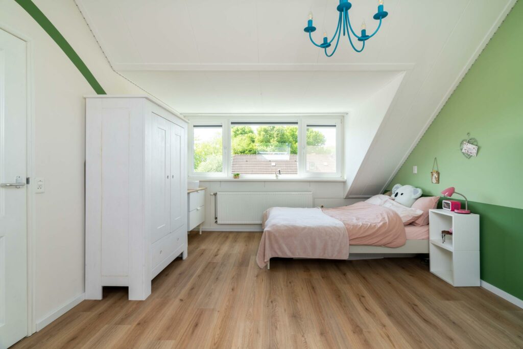 Naast de voorzolder is een grote vierde slaapkamer, eventueel op te splitsen in twee slaapkamers. De grote dakkapel en het grote Veluxraam zorgen voor veel ruimte en veel licht. De afwerking is keurig, zo zijn knieschotten gecreëerd met nette inbouwkasten en deurtjes. Op de vloer ligt een nette laminaatvloer en de ruimte heeft een strakke wandafwerking. De slaapkamer heeft een eigen wastafel.