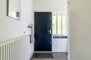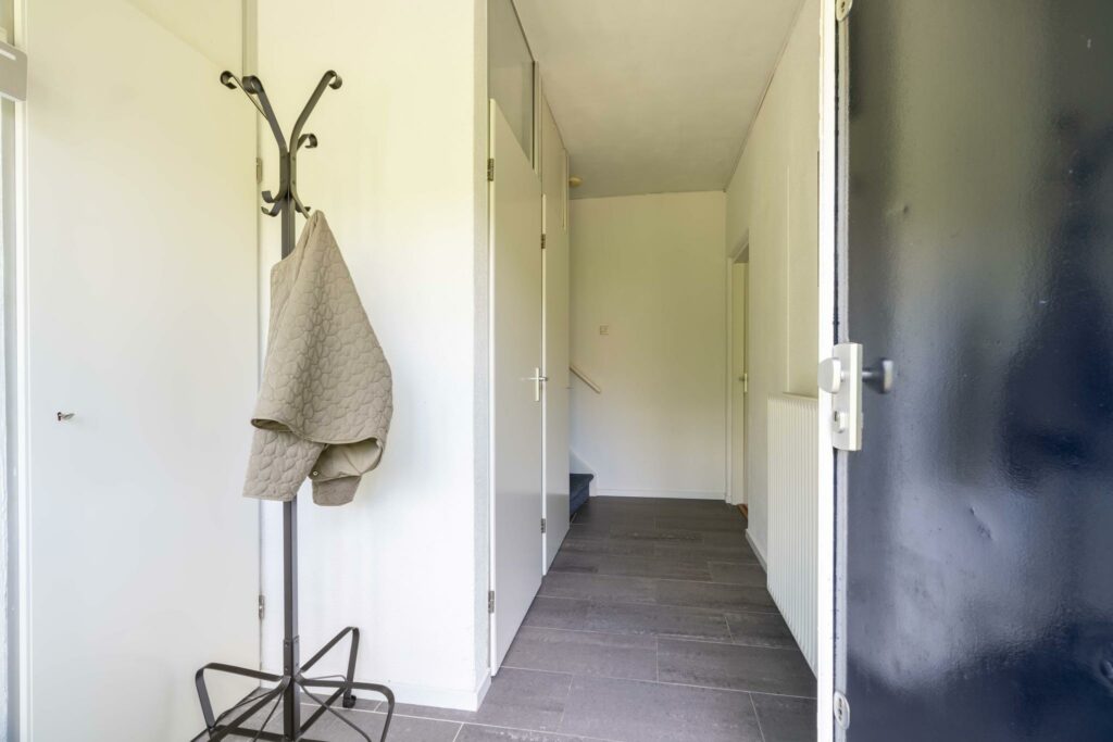 De overdekte entree brengt je in de hal. Door het grote zijraam bij de voordeur voelt deze extra licht en ruim aan. Dankzij de royale indeling is er voldoende plek voor een garderobe. Op de vloer liggen grijze plavuizen die zorgen voor een strakke en praktische afwerking. De hal biedt toegang tot het toilet, de meterkast, trapkast, de trap naar boven en de woonkamer.