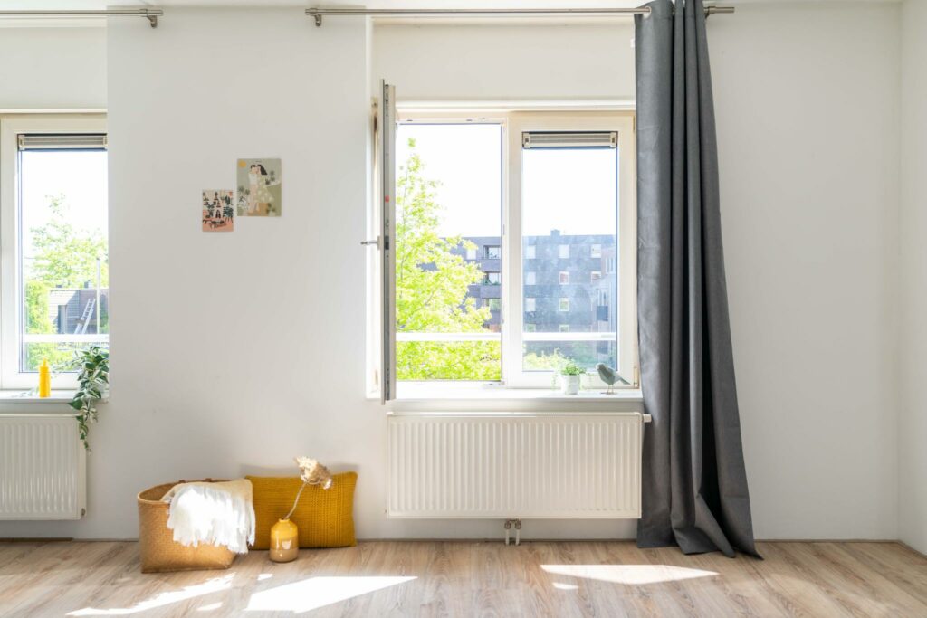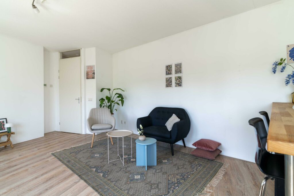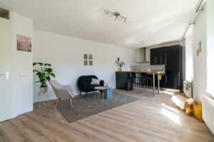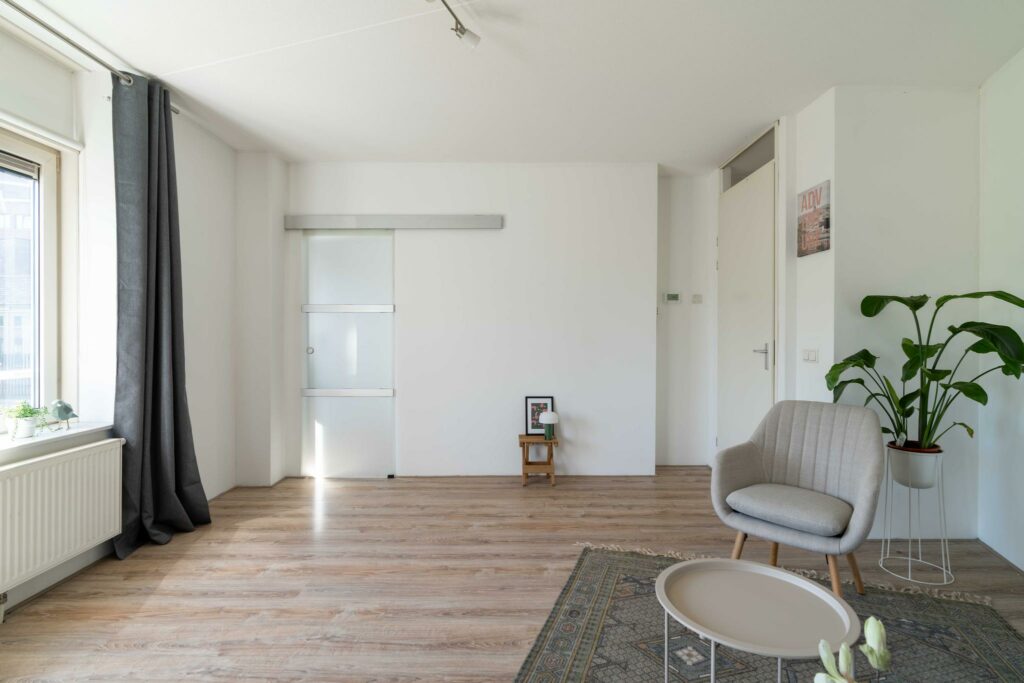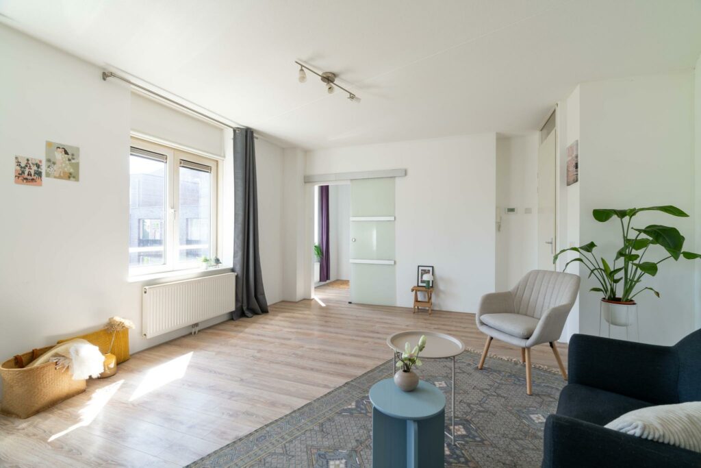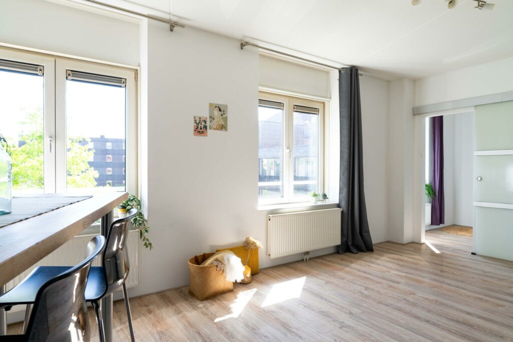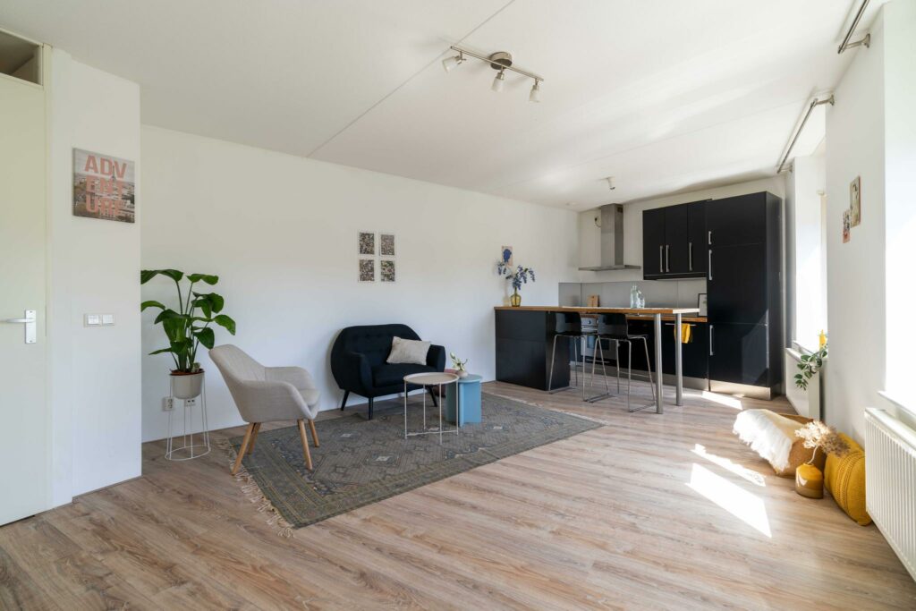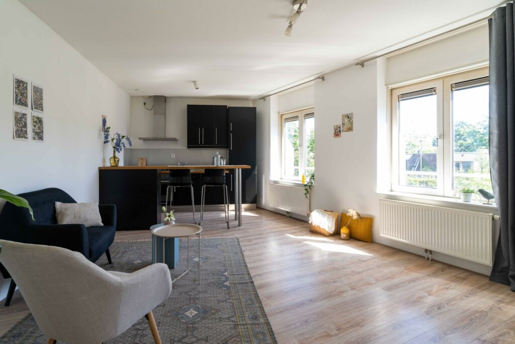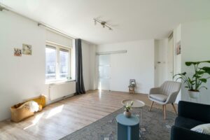 De lichte woonkamer met open keuken vormt het hart van de woning. De twee grote ramen zorgen voor plezierig veel licht, wanden zijn strak afgewerkt en op de vloer ligt een lichte houtlook laminaatvloer. Hier is genoeg plek voor een ruime zithoek.