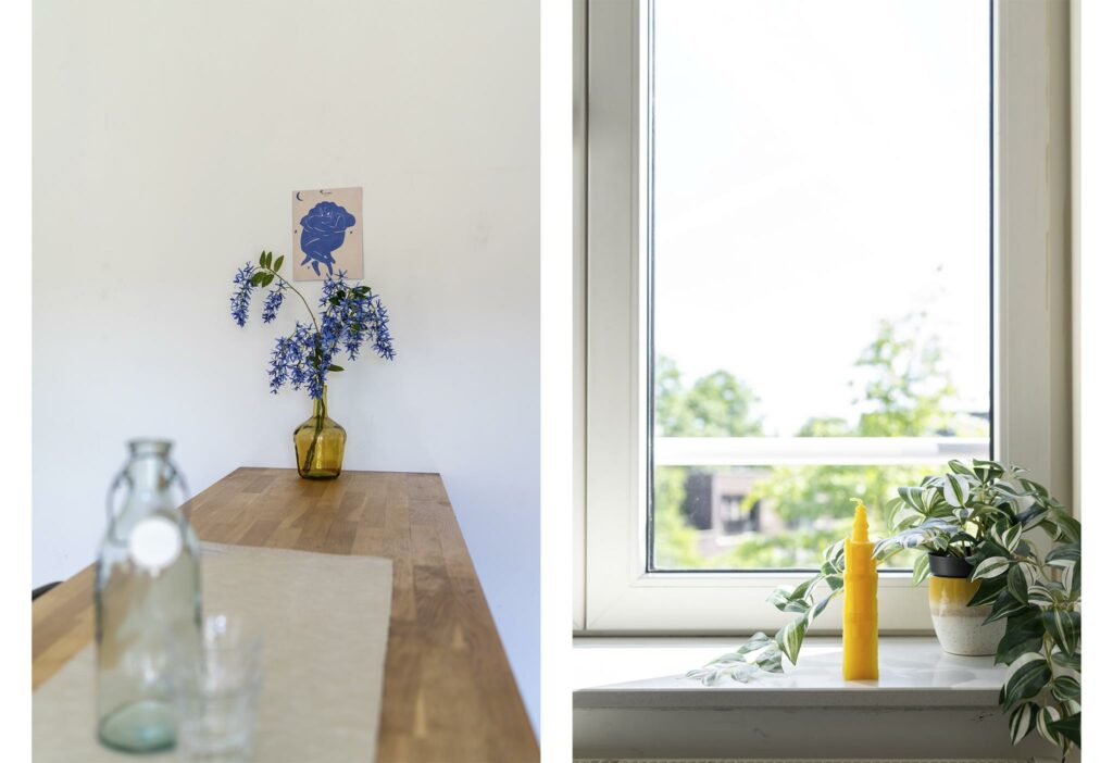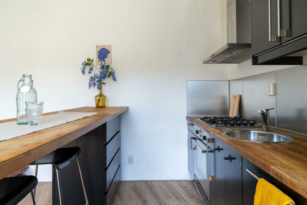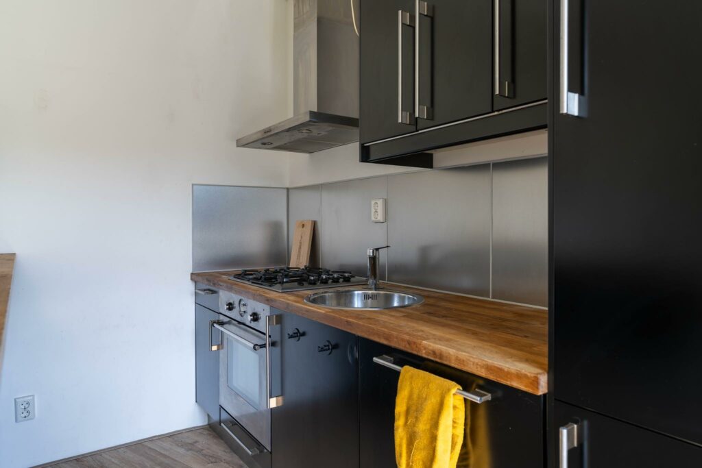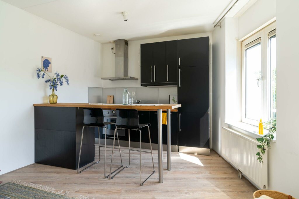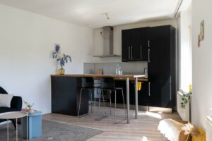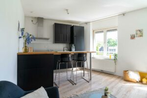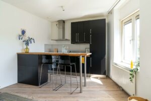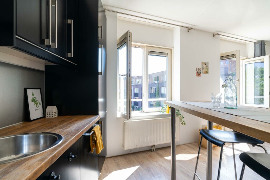 De keuken is voorzien van een gezellige bar, perfect voor een maaltijd of gezellige borrel. De open, moderne keuken is uitgerust met een koelkast, vaatwasser, oven, 4-pits fornuis en een afzuigkap. Dankzij de grote ramen valt er veel daglicht binnen en kijk je uit op een rustige, groene binnenplaats en de wijk.