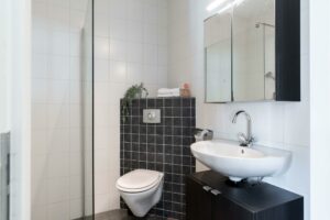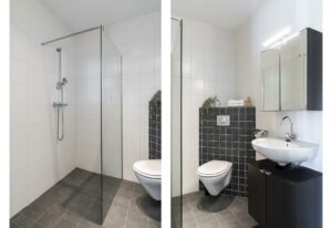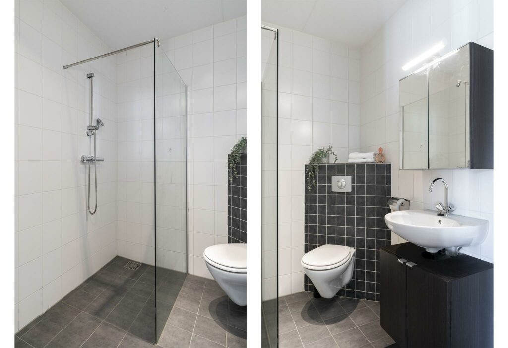 De badkamer is uitgevoerd in een neutrale zwart-witte kleurstelling en beschikt over een toilet, wastafel en een comfortabele inloopdouche.