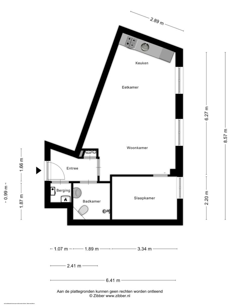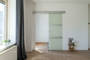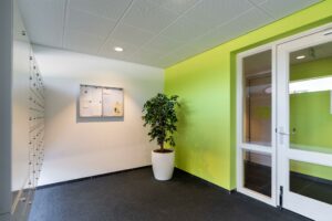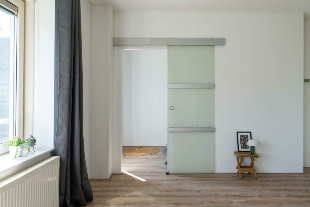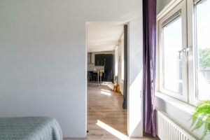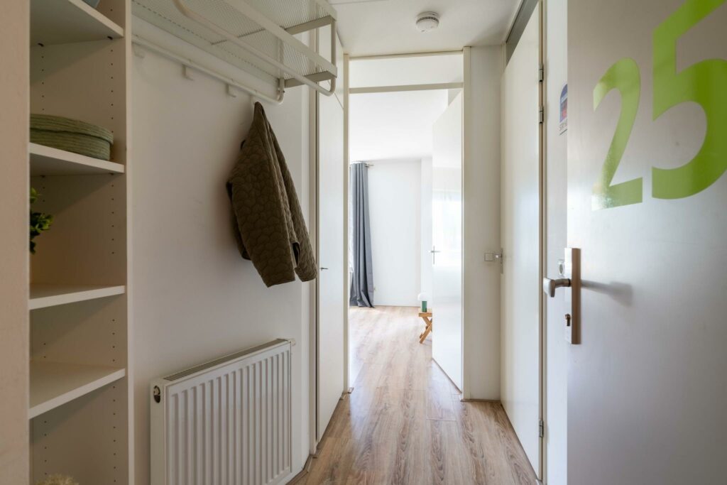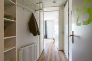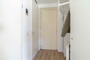 Bij binnenkomst in de hal van het appartement vind je toegang tot de badkamer, meterkast, berging met de CV-ketel en wasmachineaansluiting, en tenslotte de woonkamer.