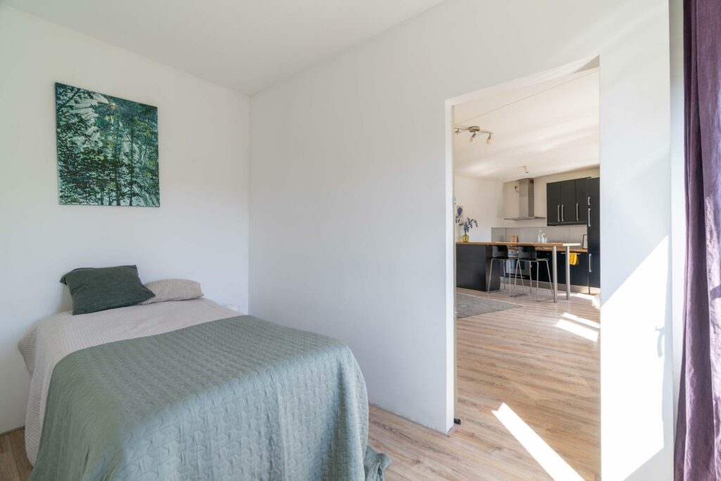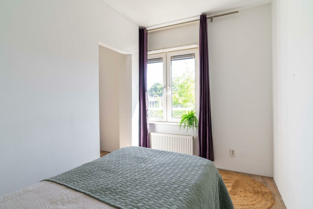 Aangrenzend aan de woonkamer ligt de slaapkamer, ruim genoeg voor een tweepersoonsbed en eveneens voorzien van prettig daglicht.
