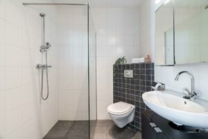 • Moderne badkamer met inloopdouche, toilet en wastafel