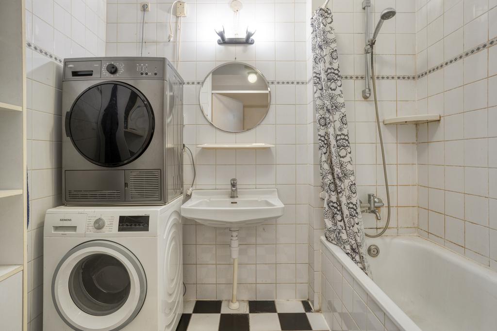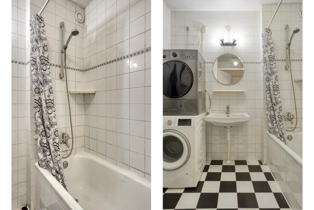De badkamer is in lichte kleurstelling en voorzien van ligbad met douche, wastafel en de aansluiting voor de wasmachine. Het toilet is separaat en bereikbaar vanuit de gang.