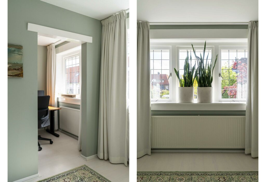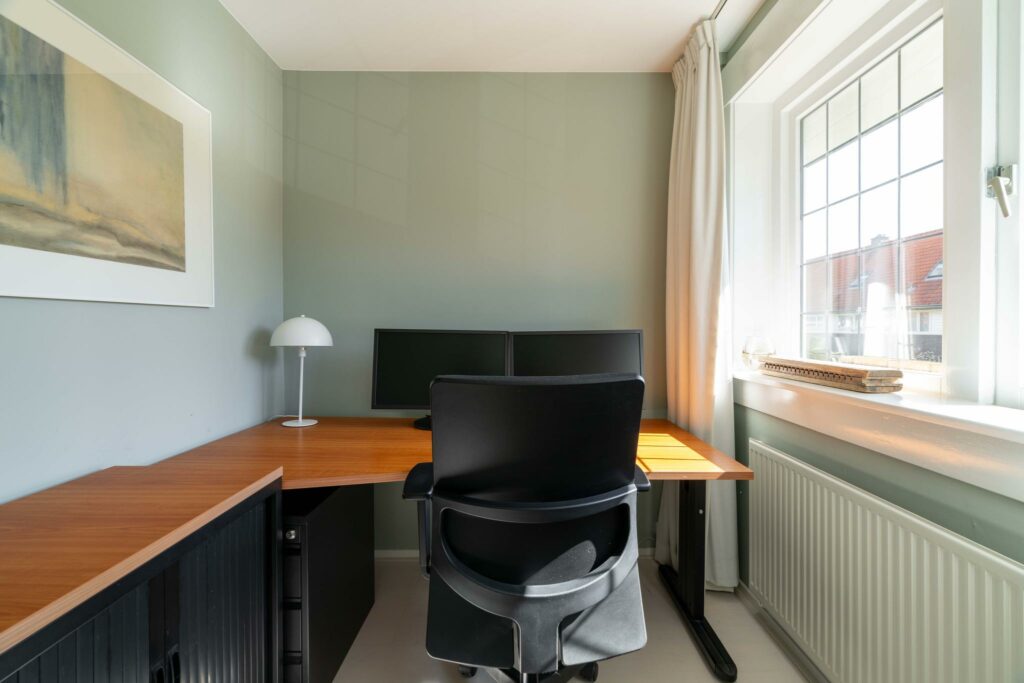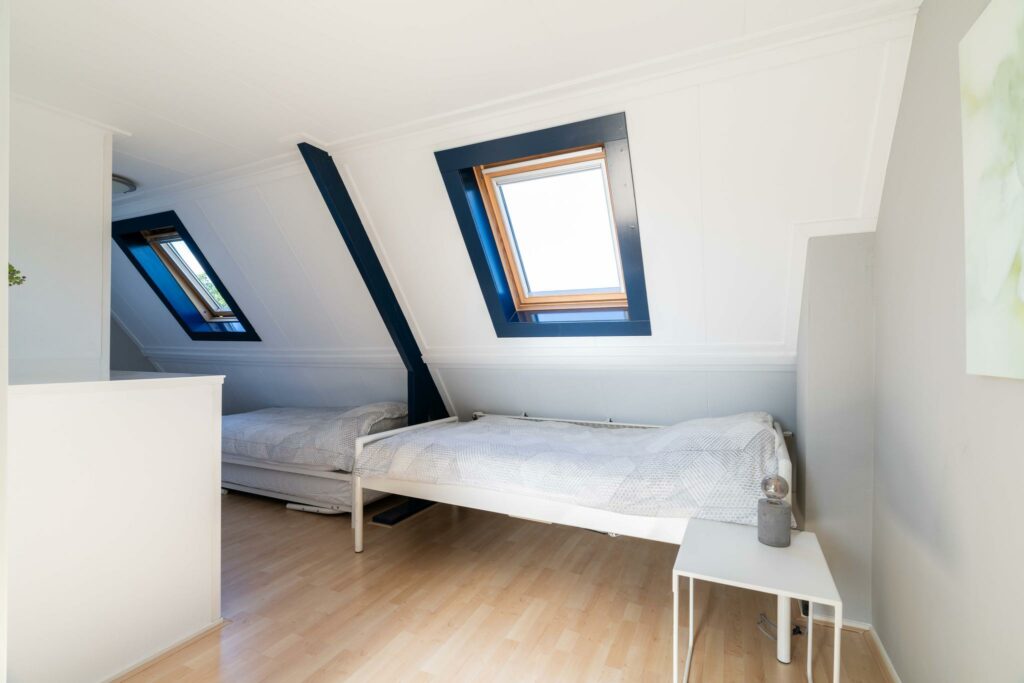 Aan de voorzijde bevinden zich twee slaapkamers (12 en 4 m2) die door de huidige eigenaar zijn samengevoegd, maar weer eenvoudig als afzonderlijke kamers kunnen worden gebruikt. De ramen zijn voorzien van glas-in-lood in dubbel glas, wat niet alleen zorgt voor extra comfort en isolatie, maar ook bijdraagt aan een authentieke en karaktervolle uitstraling.