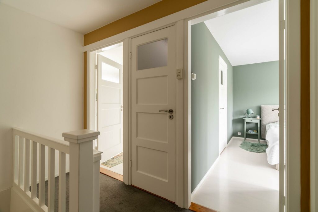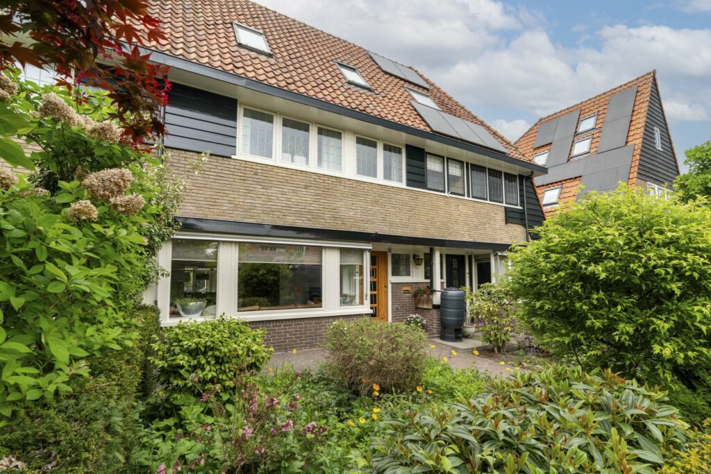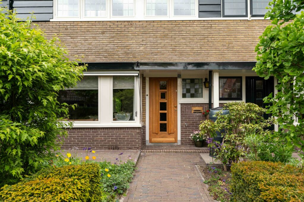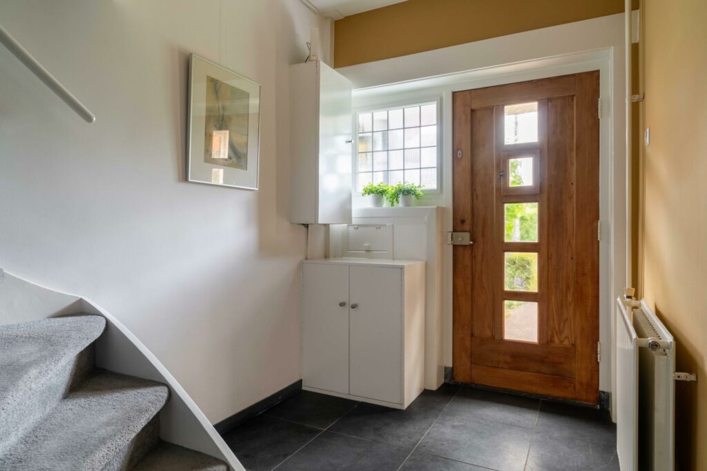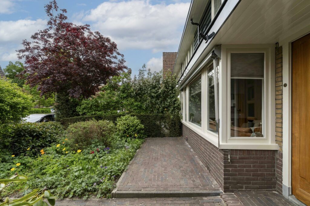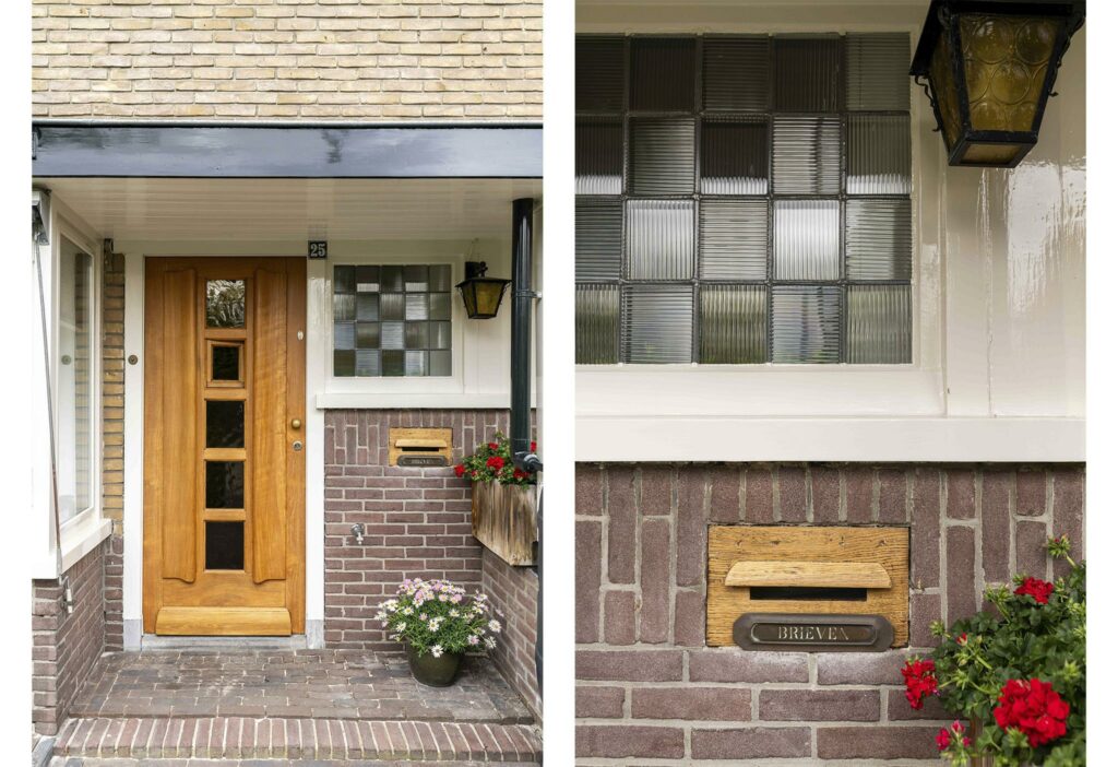 De voorgevel heeft de karakteristieke charme van de jaren ’30. De grote erker, ruime overstekken en de klassieke voordeur met zijvenster en originele brievenbus passen perfect in dit plaatje. De brievenbus is authentiek uit de jaren ’30 en de voordeur is voorzien van een klassiek kijkluikje.