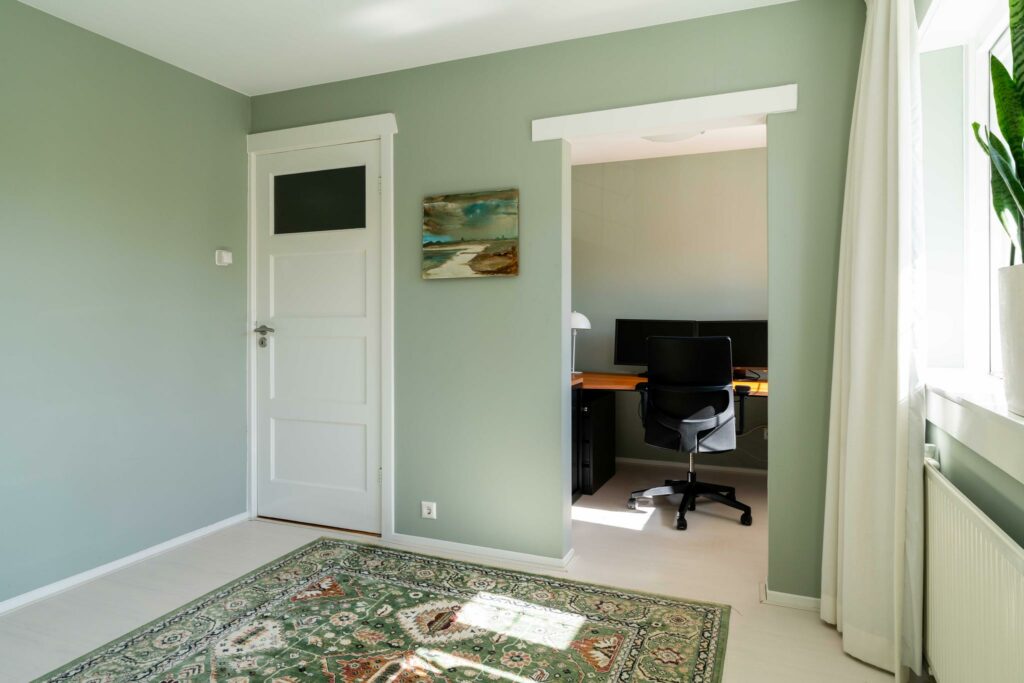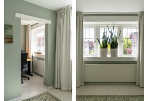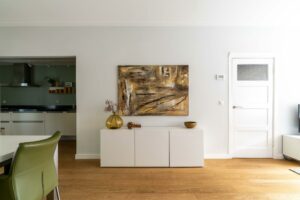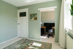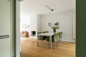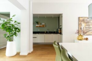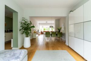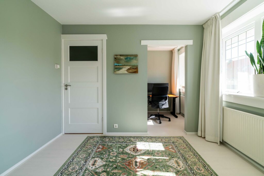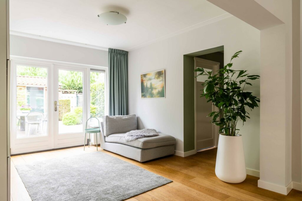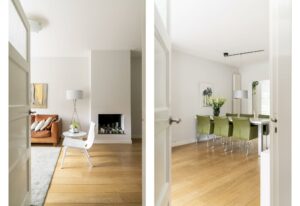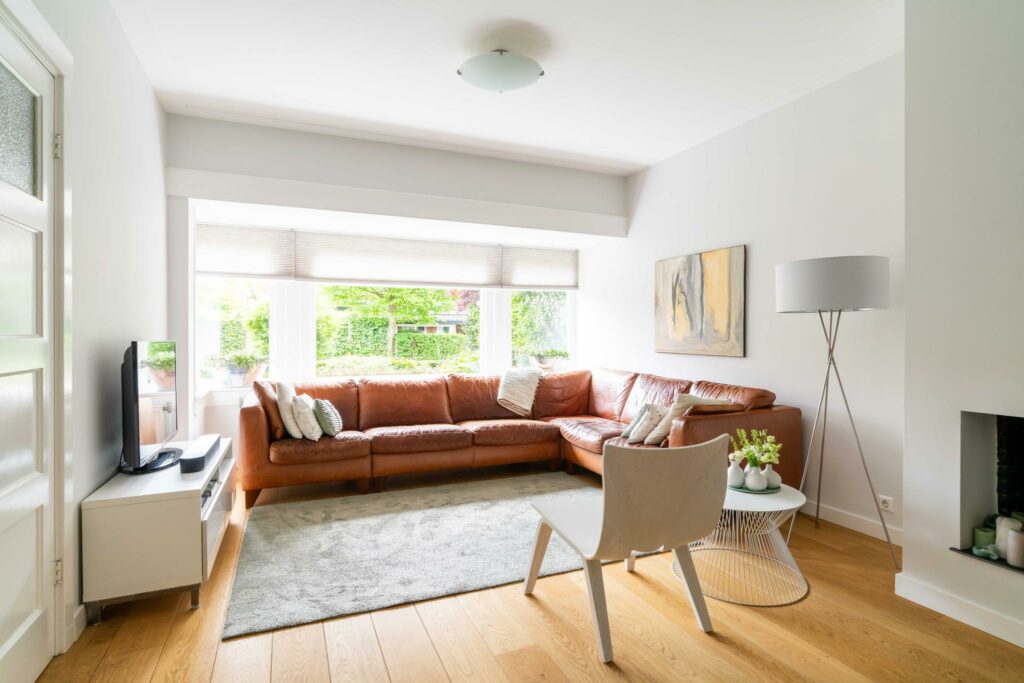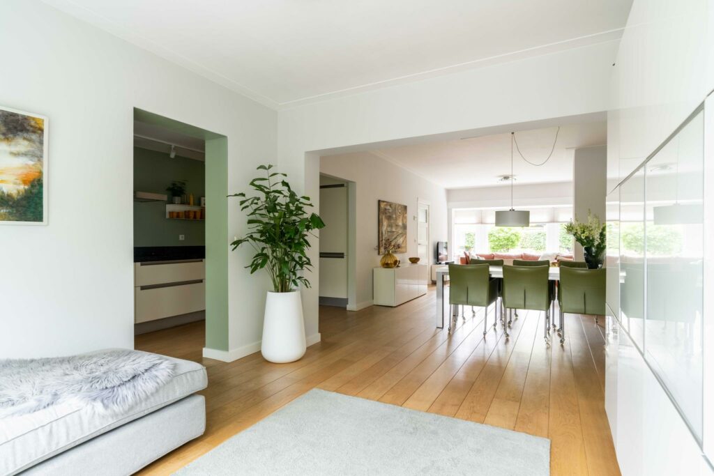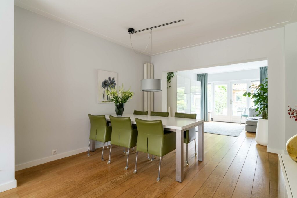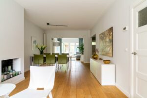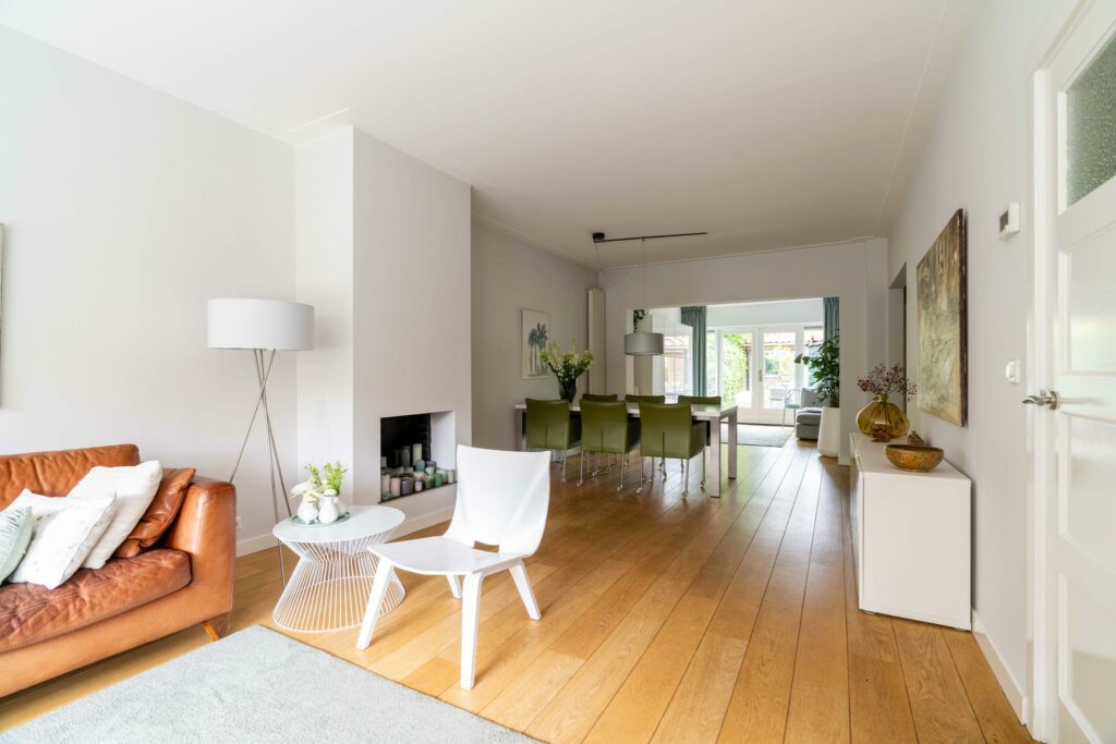 Bij binnenkomst in de woonkamer valt direct de warme uitstraling van de houten vloer op, die zich over de gehele ruimte uitstrekt. De wanden en plafonds zijn strak gestuct, wat een moderne en frisse uitstraling geeft, een mooie combinatie met de klassieke jaren ‘30 sfeer van het huis.
