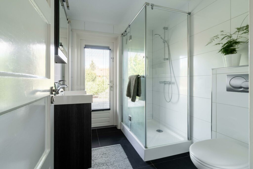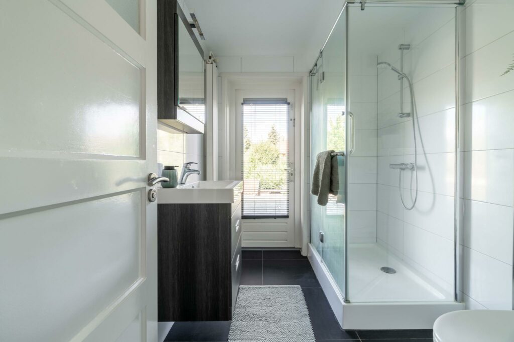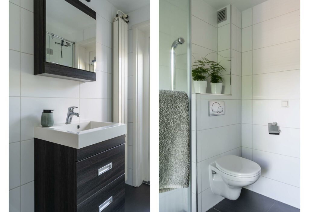 De moderne badkamer is eveneens aan de achterzijde gelegen en heeft een neutrale kleurstelling. De ruimte biedt plaats aan een ruime inloopdouche, wastafelmeubel en toilet. De badkamer heeft een deur naar het beloopbare dak van de uitbouw.
