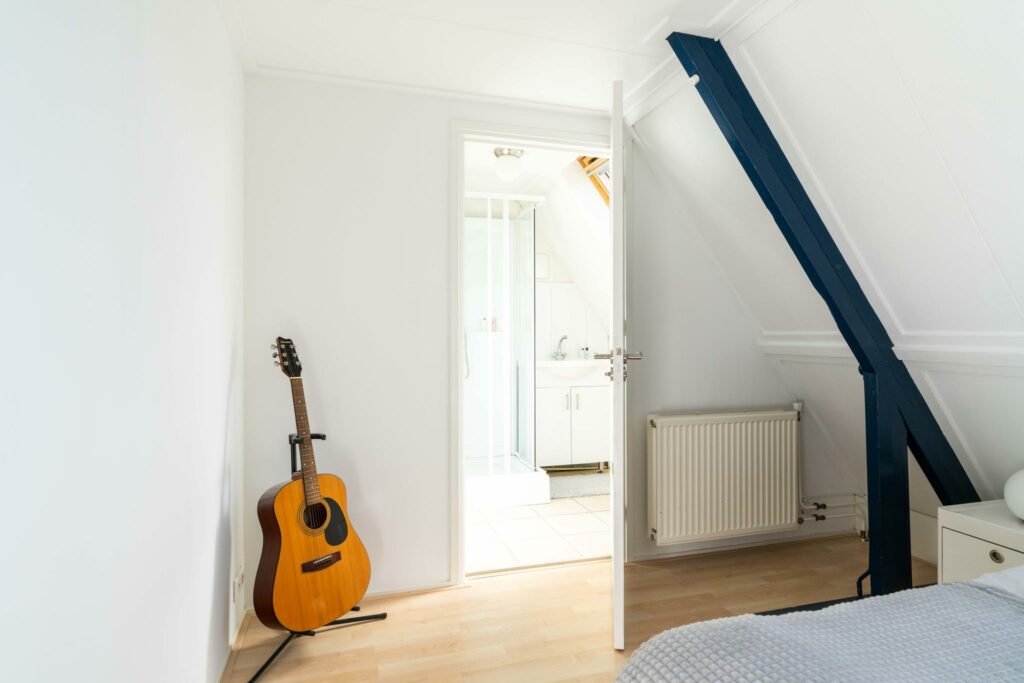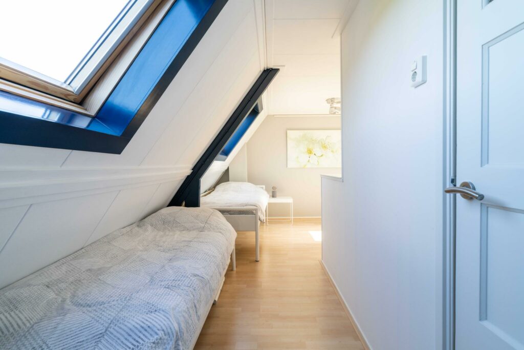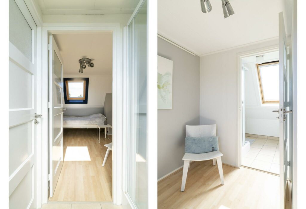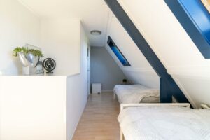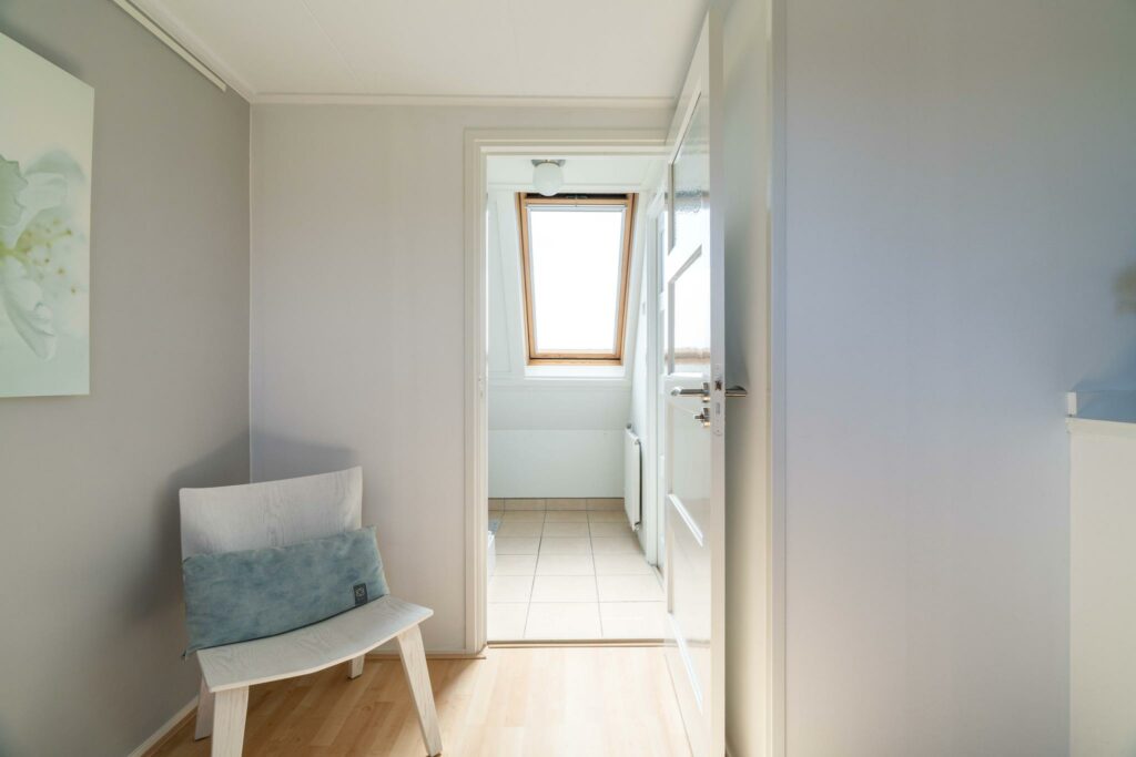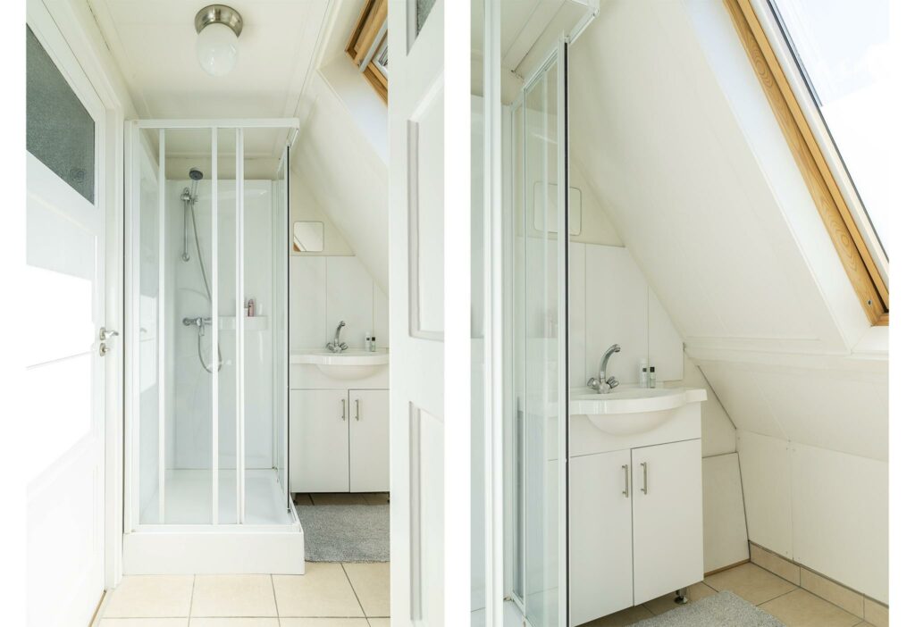 Ook deze verdieping is verrassend ruim en wederom keurig afgewerkt. Door de plaatsing van maar liefst vier dakramen, alle vier voorzien van Velux verduisterende rolgordijnen en screens, heb je hier een fijne lichtinval. De ruimte is zo ingedeeld dat er twee mooie formaat slaapkamers zijn ontstaan (ca 8 en 10 m2), met ieder toegang tot de tweede badkamer. De badkamer is voorzien van douche en wastafelmeubel.