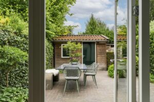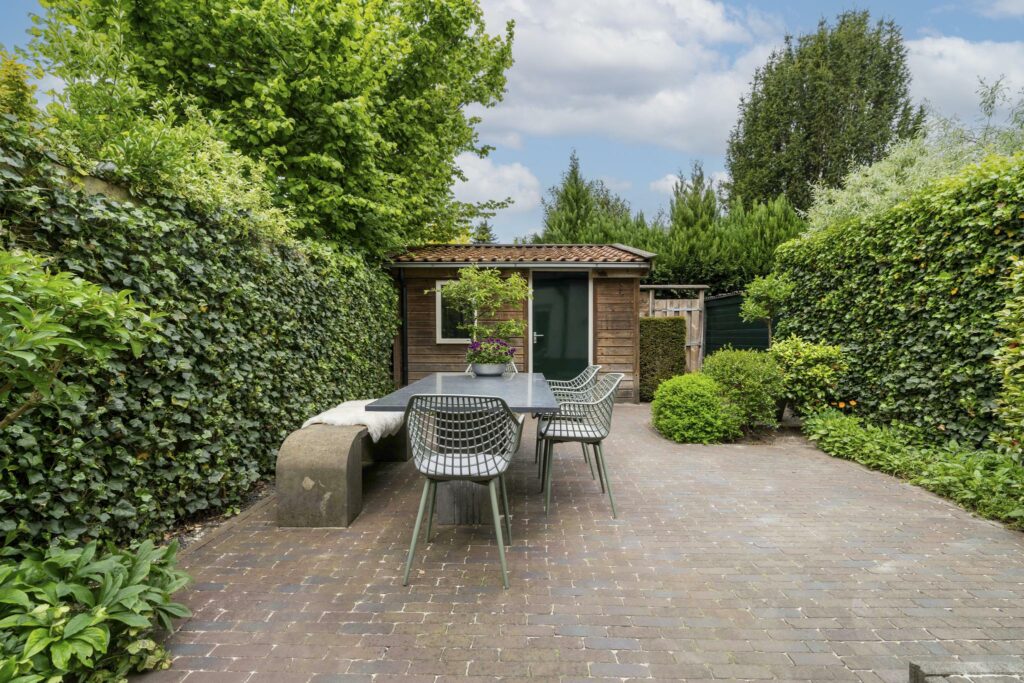 Achter op het perceel bevindt zich nog een handige berging, met genoeg plek voor meerdere fietsen en tuinspullen. Tenslotte bevindt zich hier nog de ruime poort naar de achterom.