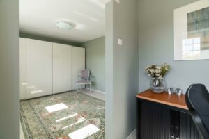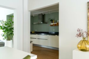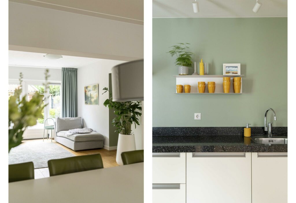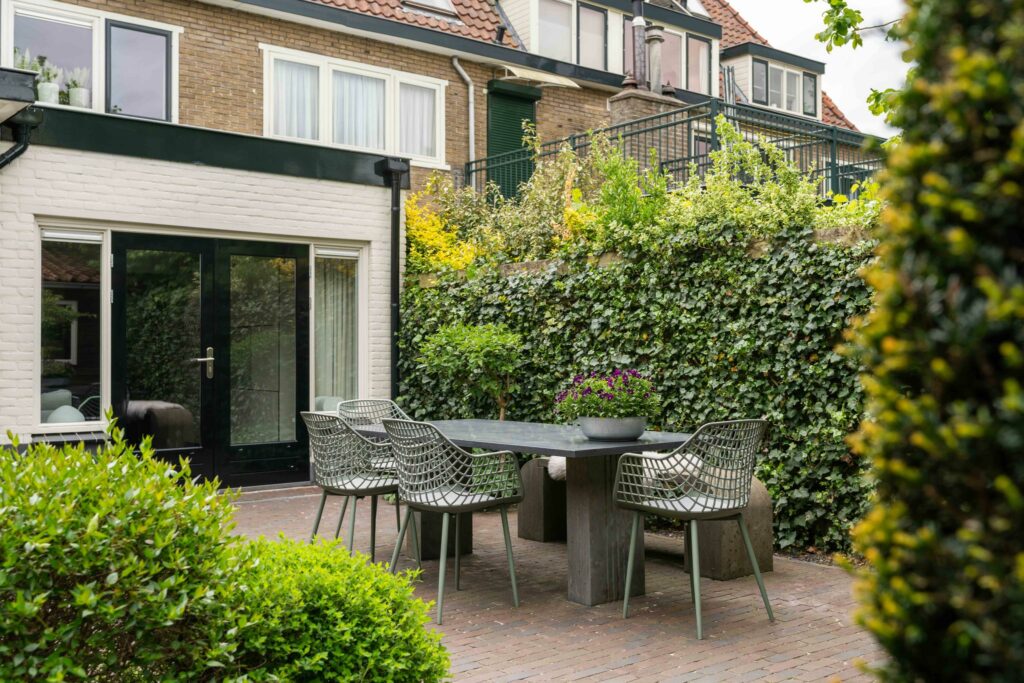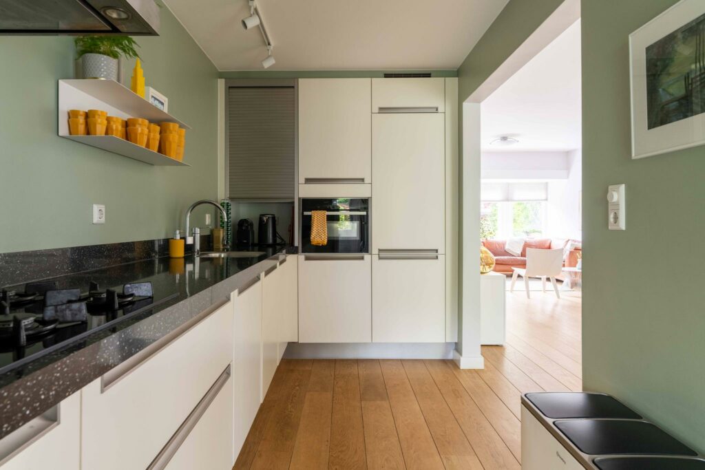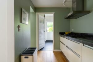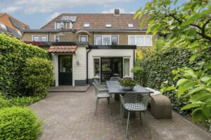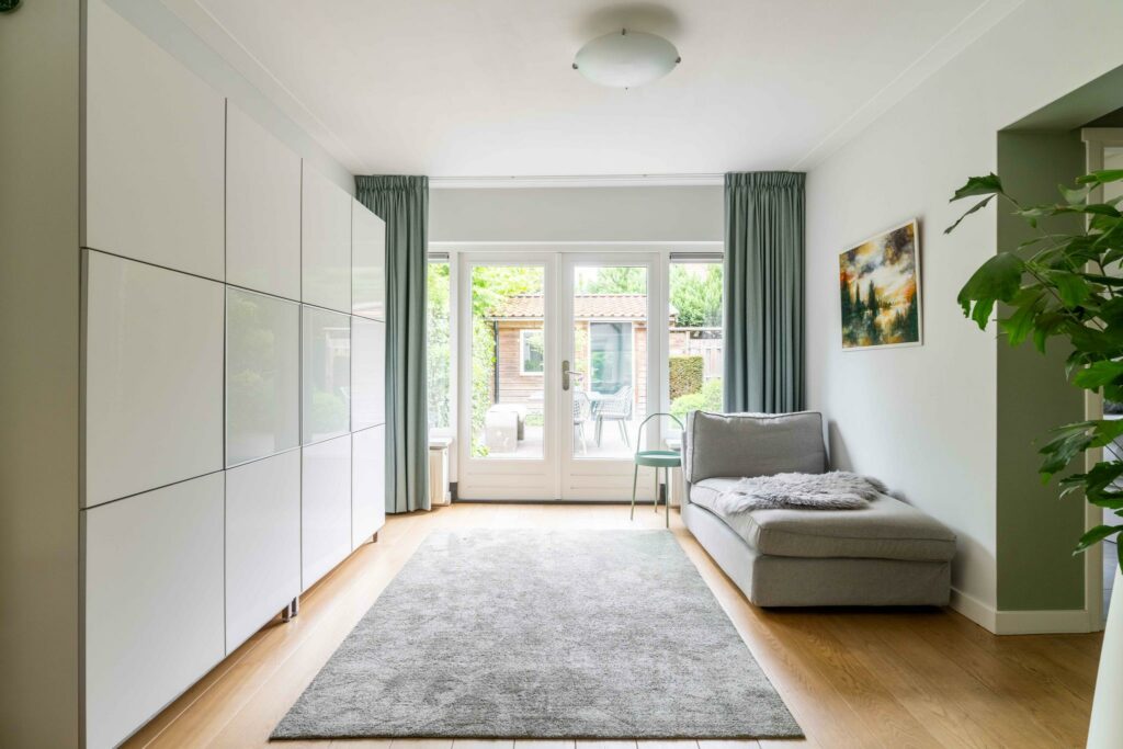 De uitbouw over de volledige breedte van het huis is zorgvuldig ontworpen, met oog voor proporties en functionaliteit. Deze geeft functie aan zowel extra leefruimte als aan een praktische bijkeuken. Het verlengstuk van de leefruimte leent zich uitstekend als leeshoek of een speelhoek voor de kinderen. De openslaande deuren aan de achterzijde zorgen voor een overvloed aan natuurlijk licht en creëren een fijne overgang naar de zonnige tuin.