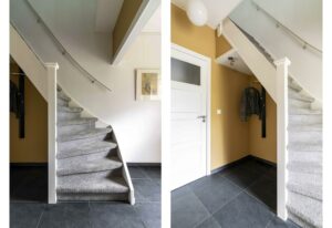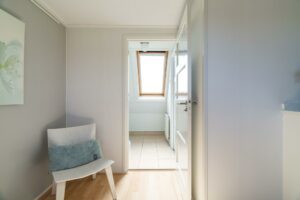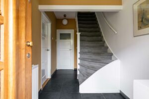 Bij binnenkomst in de bijzonder ruime hal ervaar je direct de sfeer die deze woningen zo geliefd maakt. De fraaie paneeldeuren in combinatie met de glad gestucte muren creëren een stijlvolle en moderne uitstraling. In de hal bevinden zich de meterkast, het toilet, de trapopgang naar de eerste verdieping en toegang tot de woonkamer. Het toilet is verplaatst en daardoor aanzienlijk vergroot. Het is uitgevoerd met een hangend closet en een fonteintje. De kleurstelling is grijs-wit, wat zorgt voor een moderne en frisse uitstraling.