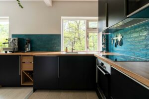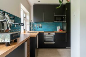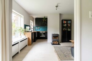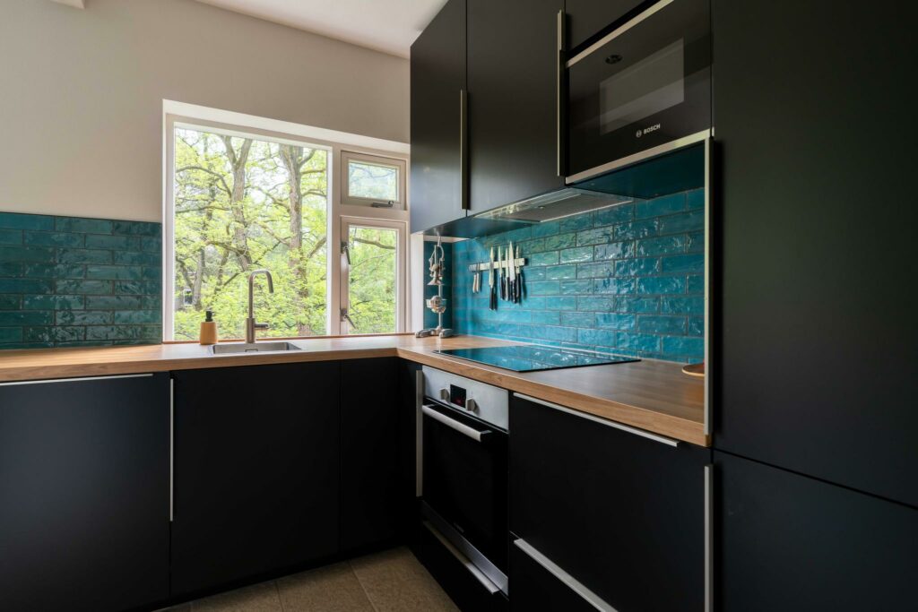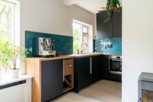 Grenzend aan de woonkamer bevindt zich de halfopen keuken die in 2023 is geplaatst. De keuken is voorzien van moderne inbouwapparatuur zoals een kookplaat, combi-oven en vaatwasser. De gekozen kleurstelling doet tijdloos aan. Een heerlijke plek om te kokkerellen.
