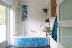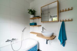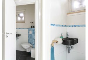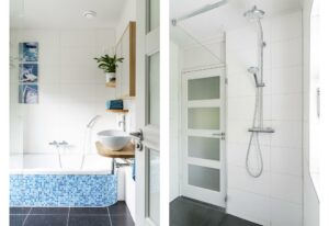 Naast de slaapkamer ligt de badkamer met inloopdouche, ligbad, wastafel en ook hier weer een balkon. Dit balkon ligt aan de zijkant van het appartement. De badkamer is ruim met fijn licht door het glas van de deur. In de badkamer vind je vloerverwarming. Grenzend aan de badkamer vind je het moderne toilet met fonteintje in dezelfde look and feel als de badkamer.