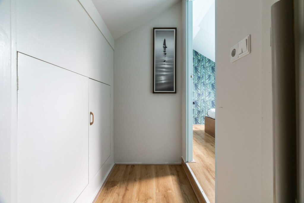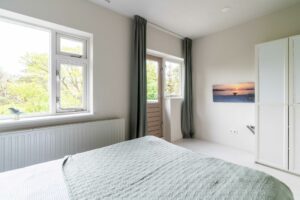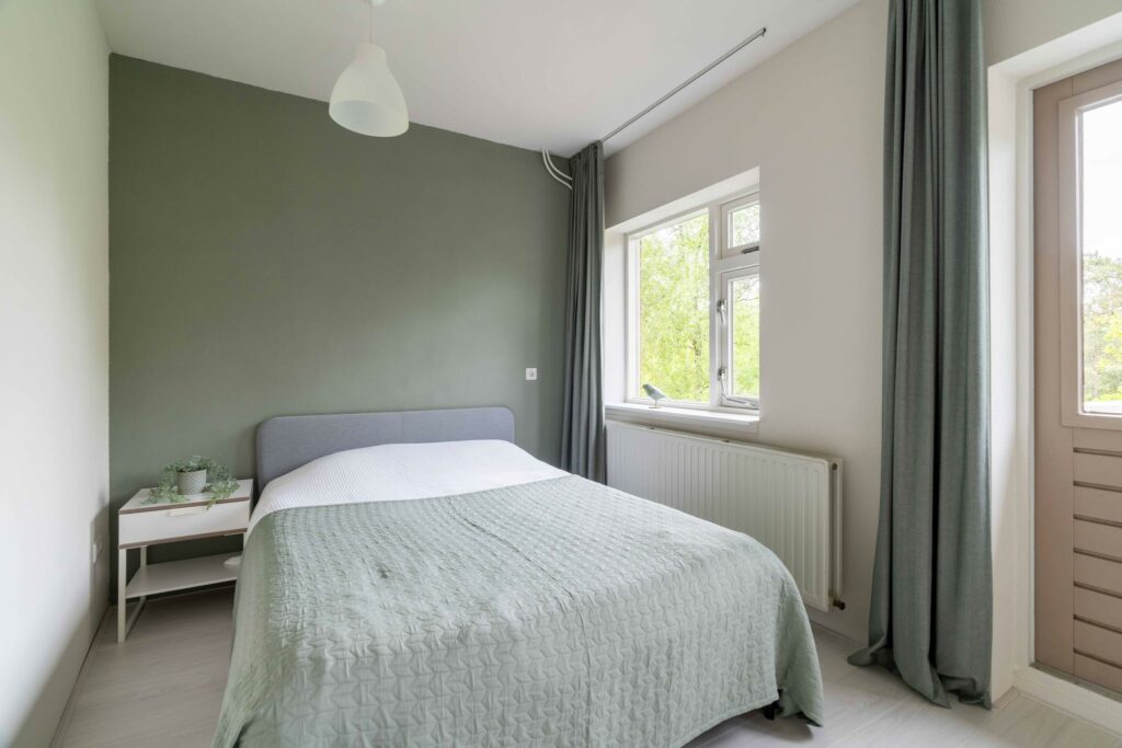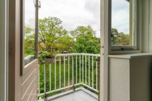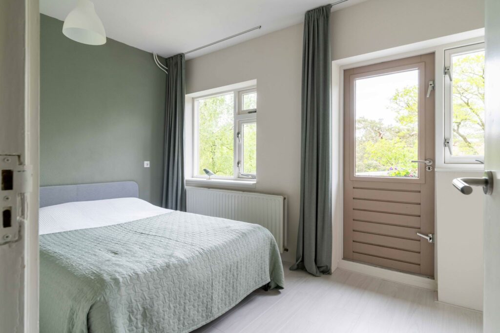 In de hal ligt aan de rechterkant de eerste slaapkamer met een tweede balkon waarbij je uitkijkt over de straat en het groen. Een fijne kamer met veel licht en ruimte waar eenvoudig een extra wastafel kan worden geplaatst.