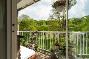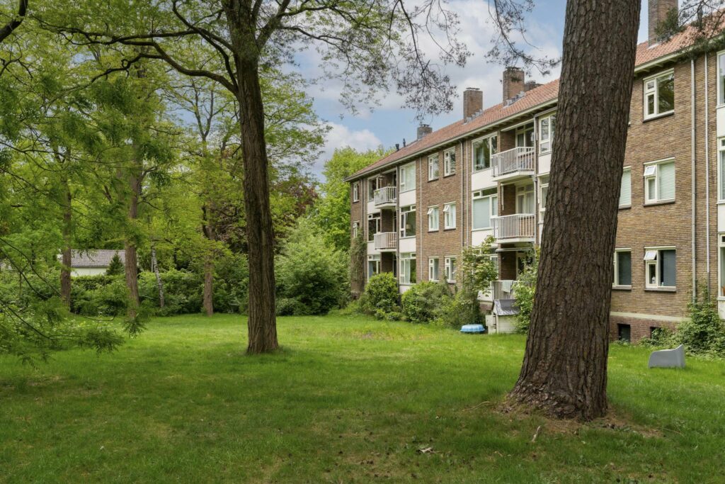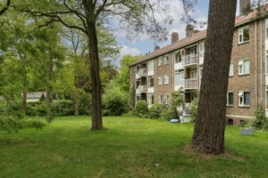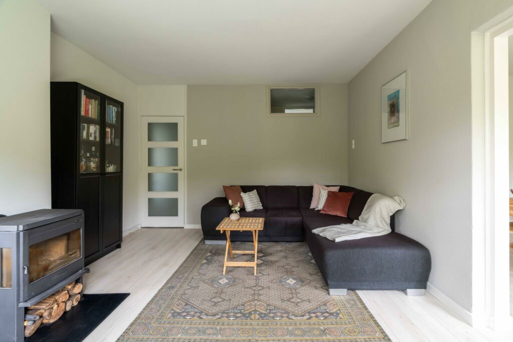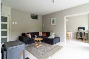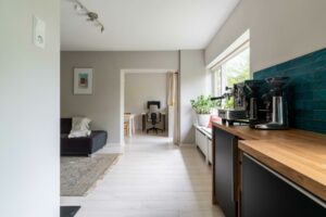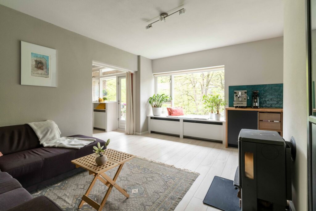 Het gehele appartement is voorzien van goed afgewerkte wanden en plafonds en over de gehele vloer ligt laminaat. Via de hal heb je toegang tot de woonkamer aan de zuidzijde van het complex. De grote raampartijen halen het heerlijke zonlicht naar binnen. Een werkende houtkachel is strategisch geplaatst zodat je hier knusse avonden kunt hebben. De slaapkamer aan de oostkant is als eetkamer bij de woonkamer betrokken. Hierdoor heb je een fijne, ruime eetkamer met balkon aan de zuidkant. Veel groener en zonniger kun je bijna niet vinden.