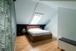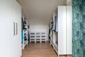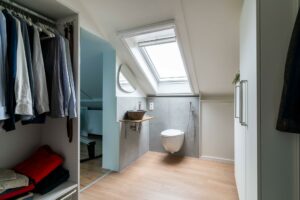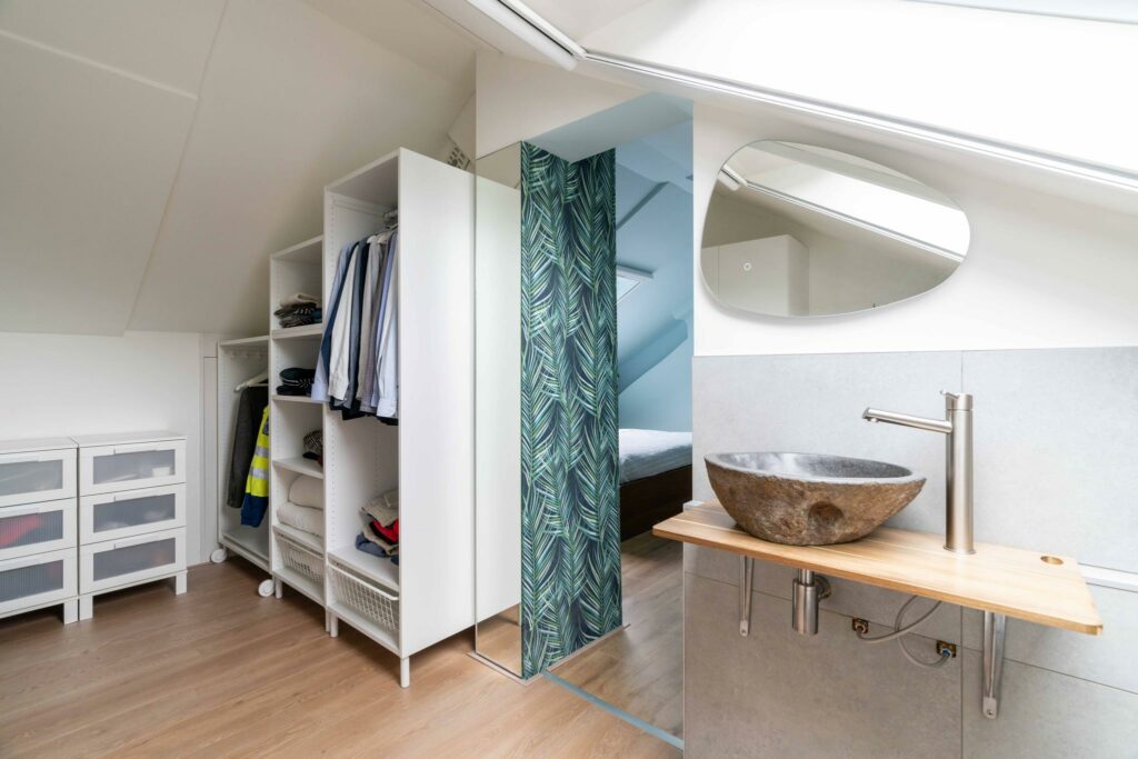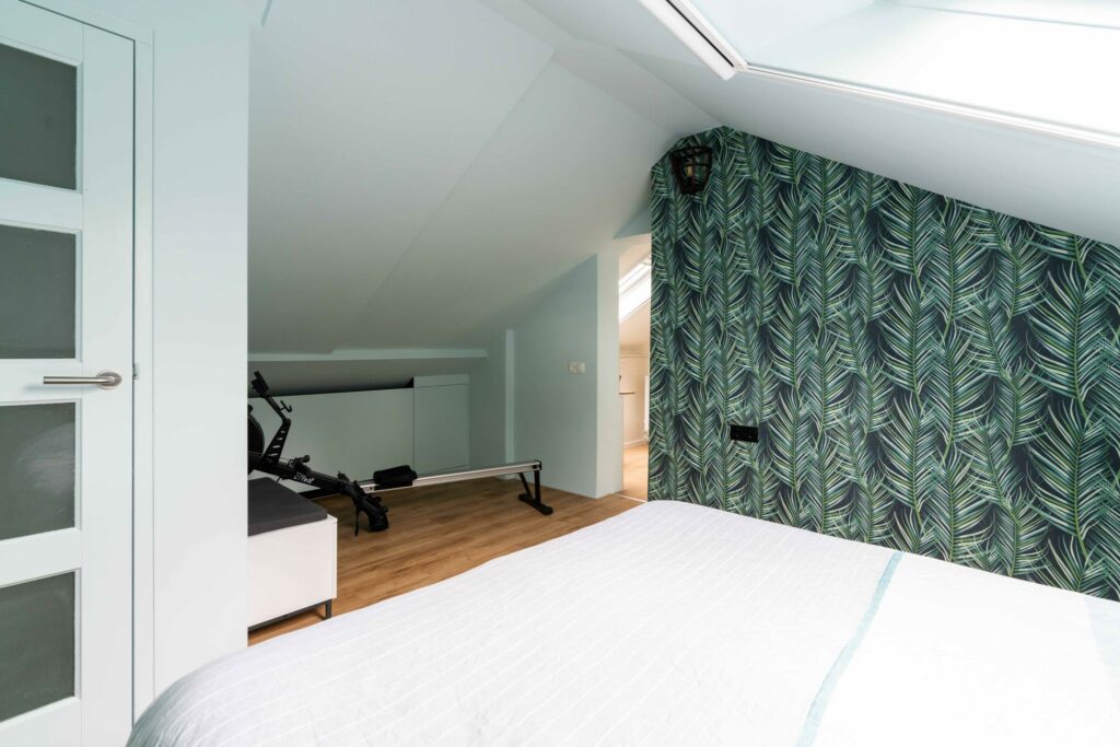 Op de bovenste woonlaag kom je via de overloop in de ruime slaapkamer. Door de dakramen valt heerlijk daglicht naar binnen. Deze kamer is ruim en grenst aan een mooie ruimte die nu in gebruik is als inloopkast. Hier is een tweede toilet met fonteintje gerealiseerd.