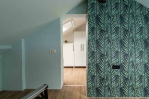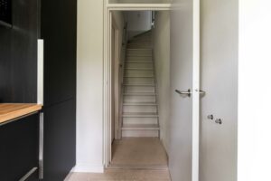 Naast de keuken is een praktische berging gemaakt waar je ook de wasmachine opstelling vind. Met een mooie schuifdeur kun je deze berging uit het zicht afsluiten. De vaste trap naar de volgende woonlaag ligt naast de berging.