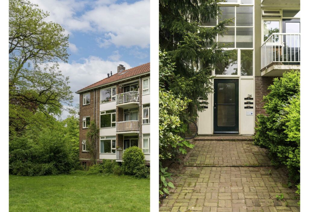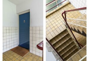 Op de begane grond bevindt zich de centrale toegang met de bergingen en de trapopgang naar de appartementen. Via het trappenhuis kom je op de derde verdieping bij de voordeur met het originele kijkraampje.