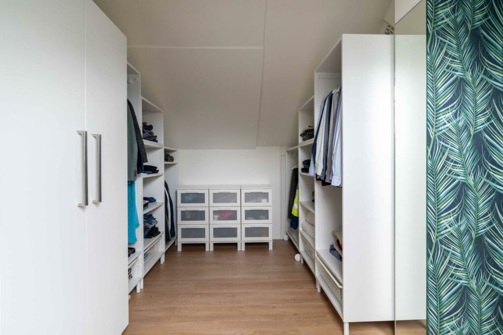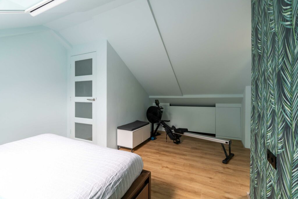 Heel slim is een vliering boven de trap gemaakt met warmtepomp en warmte installatie. Op deze verdieping vind je meer dan voldoende bergruimte in de knieschotten. Wat een goede indeling!