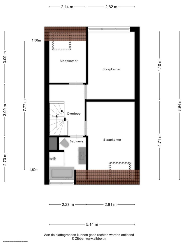 De overloop geeft toegang tot drie slaapkamers. De grootste slaapkamer aan de voorzijde meet ca. 13m2. Aan de achterkant van het appartement liggen twee kamers van 12m2 en 6m2, een mooie maat voor een werkkamer.