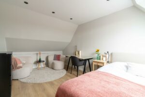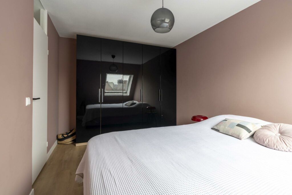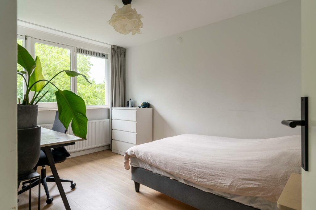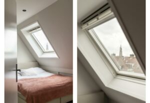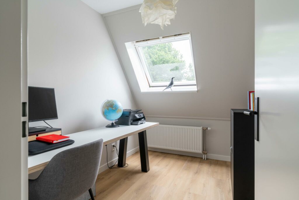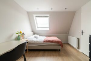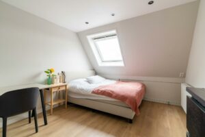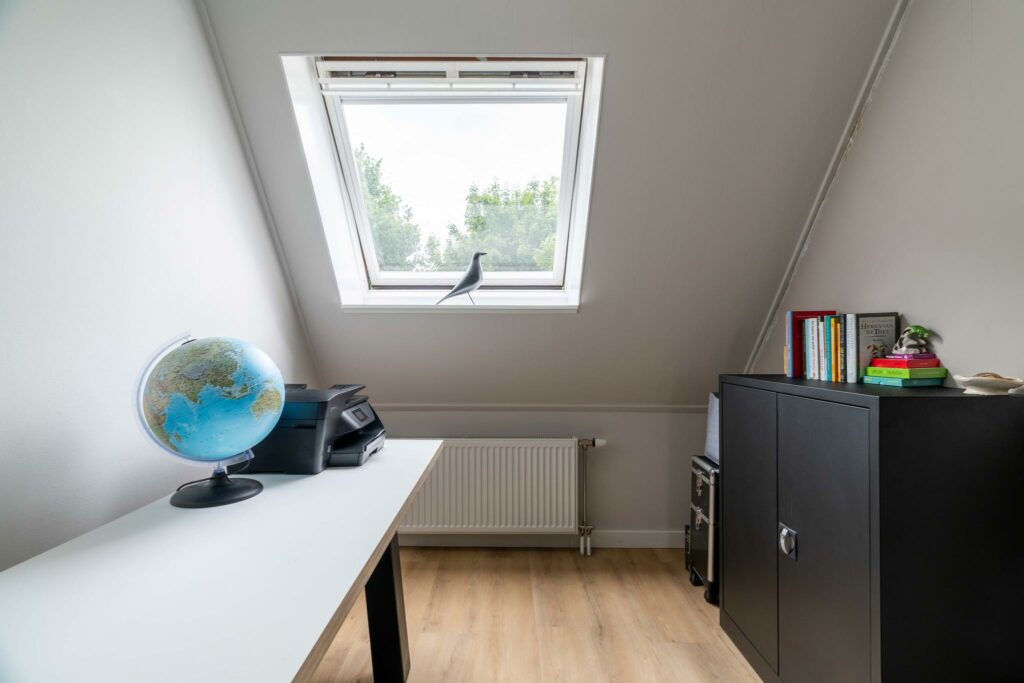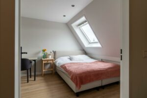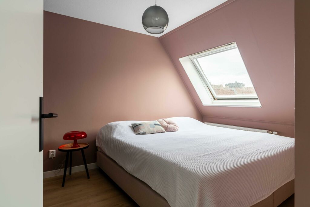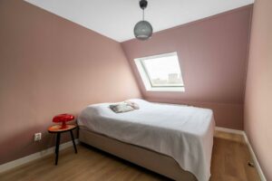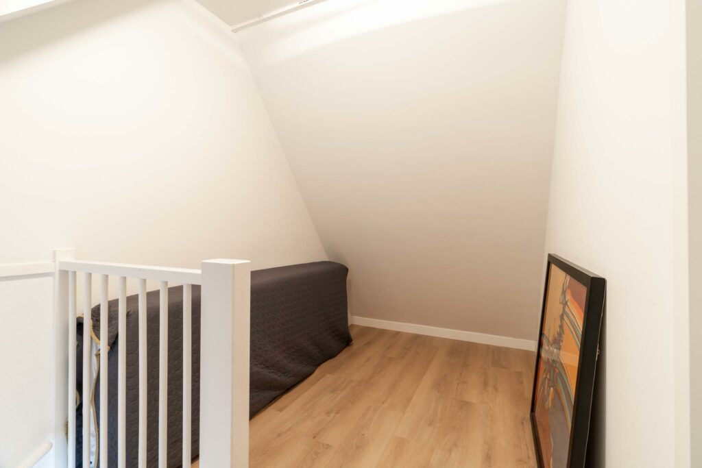 Op deze verdieping ligt de gezellige, ruime vierde slaapkamer, eveneens voorzien van een nette vloerafwerking. Door het dakraam heb je zicht op de toren van Amersfoort, wat een prachtig detail.