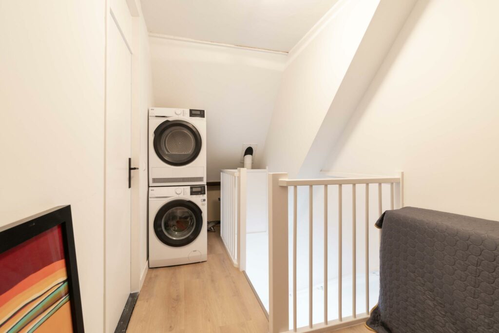 Op de voorzolder vind je de aansluitingen voor wasmachine en droger. Daarnaast is voldoende bergruimte om je spullen op te slaan.