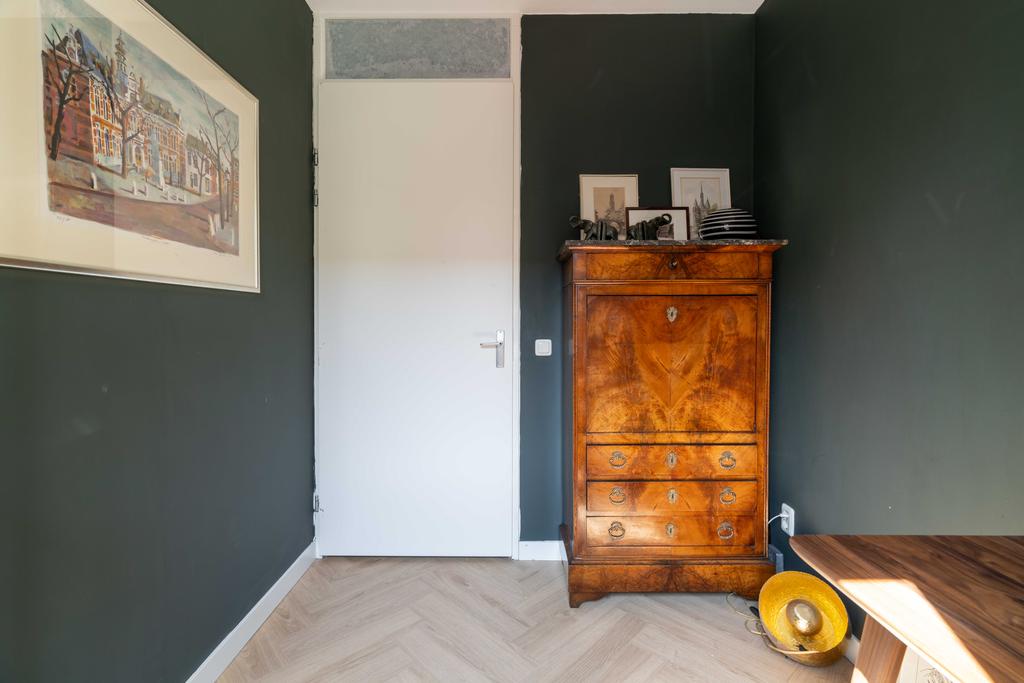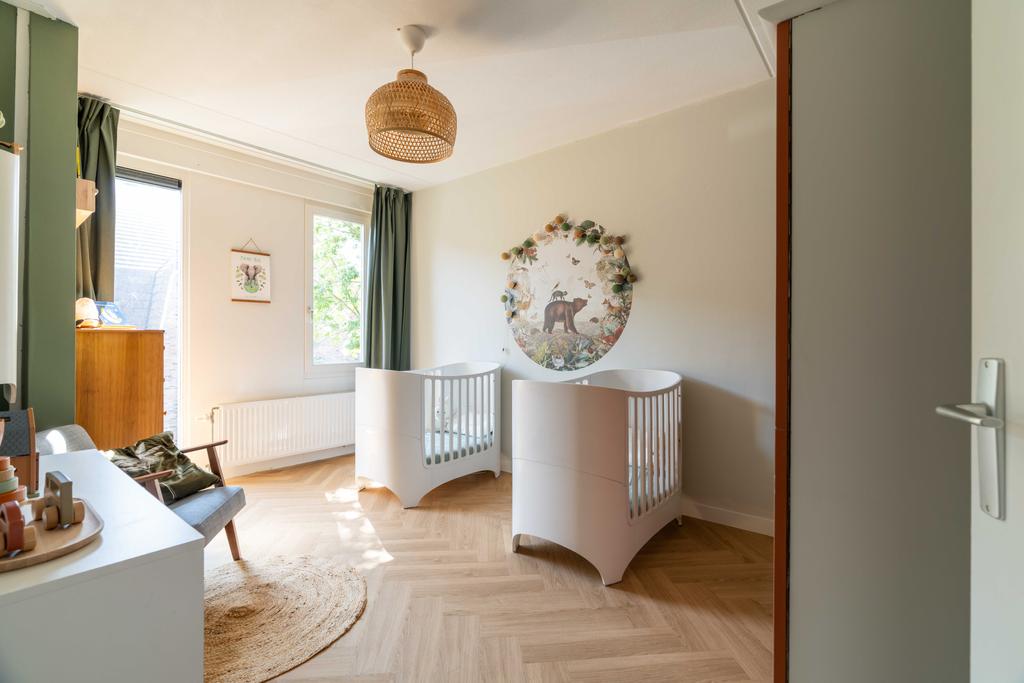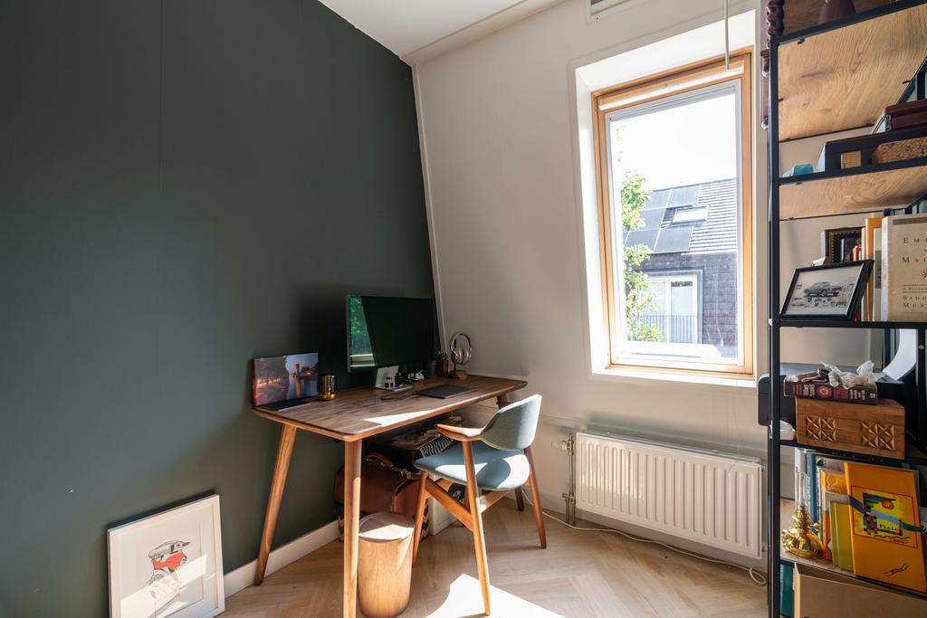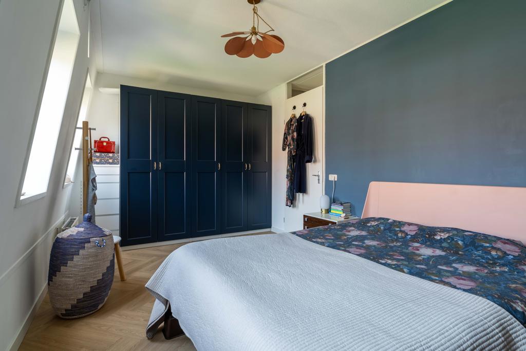 De grootste slaapkamer bevindt zich aan de achterzijde van de woning en strekt zich uit over de volledige breedte. Met een oppervlakte van circa 17 m² is deze kamer opvallend ruim en biedt dan ook moeiteloos plaats aan een royaal bed en een grote wandkast. Drie grote Veluxramen zorgen voor veel natuurlijk licht, terwijl de schuine lijnen van de mansardekap de ruimte sfeer en karakter geven. De tweede en derde slaapkamer bevinden zich aan de voorzijde van het huis. De tweede kamer meet ook maar liefst circa 15 m2 en is heerlijk licht door twee grote ramen waarvan een met glas tot aan de grond. De derde kamer meet 6 m2 en is daarmee een fijne werkkamer of babykamer.