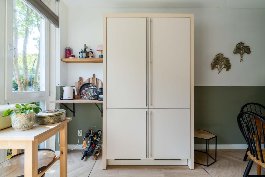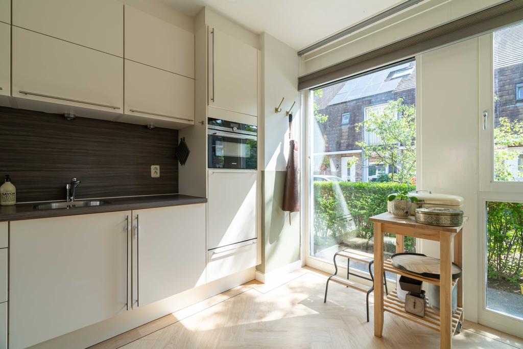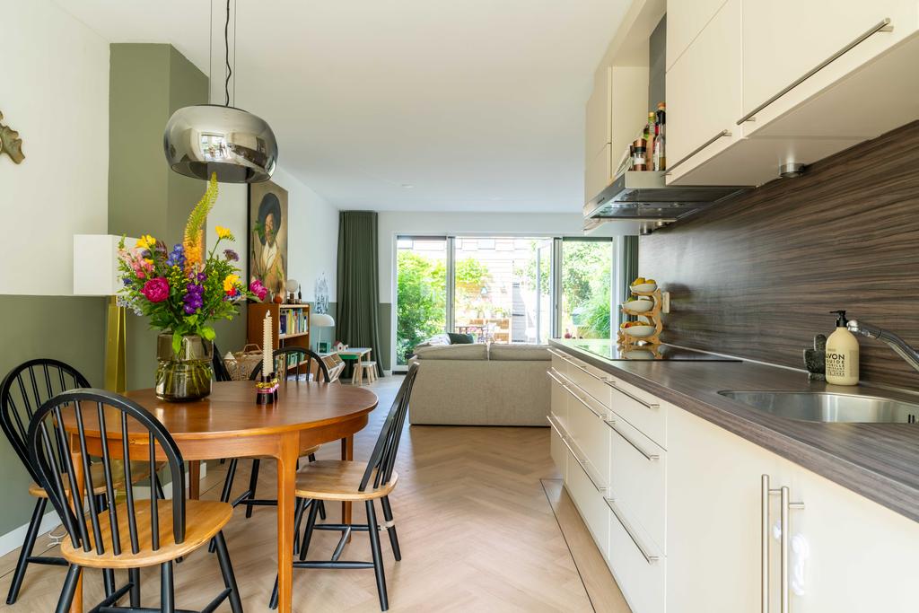 Aan de voorzijde van de woning bevindt zich de ruime open keuken in een praktische parallelopstelling. Dankzij de grote ramen tot aan de grond valt er volop natuurlijk licht binnen, wat zorgt voor een prettige en open sfeer. De keuken heeft een lichte kleurstelling en een houtlook werkblad. Verder is deze voorzien van alle benodigde inbouwapparatuur, waaronder een inductiekookplaat, combi-oven/magnetron, vaatwasser, een ruime koelkast én een aparte grote vriezer. Dankzij het royale formaat van de keuken is er voldoende ruimte voor een eethoek, waardoor koken en tafelen op een fijne manier samenkomen.