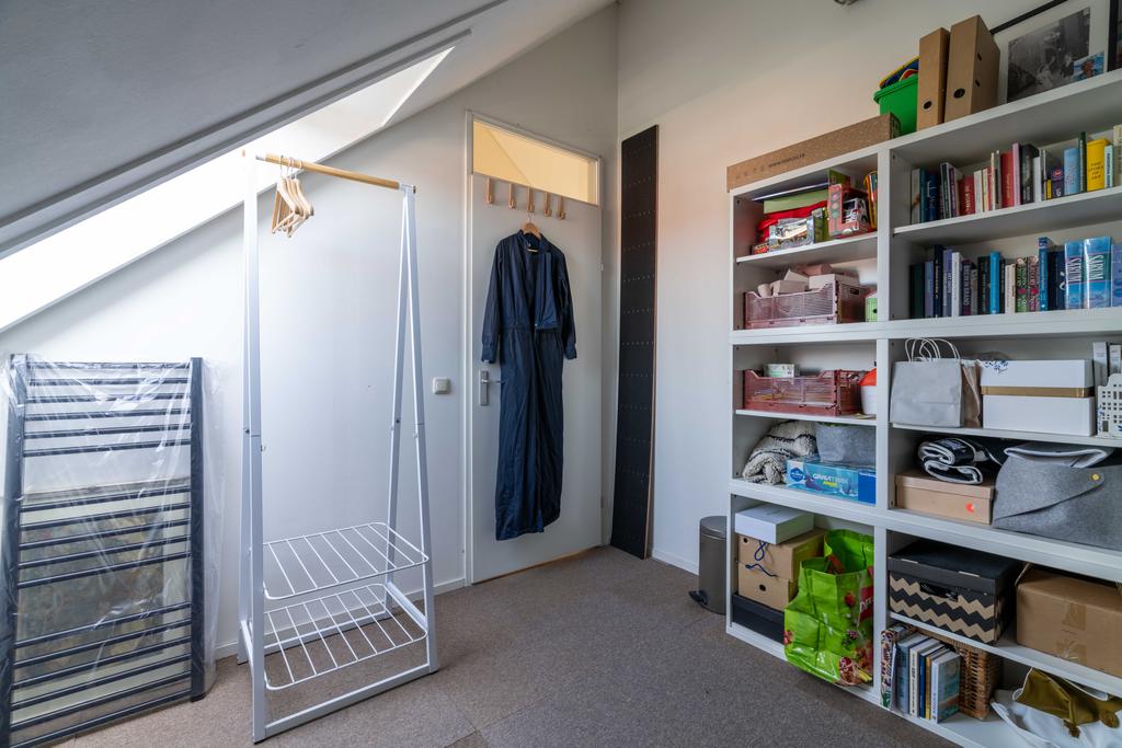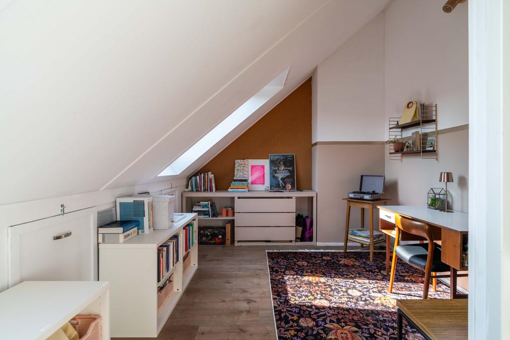 De kamer aan de voorzijde beslaat de volledige breedte van de woning en krijgt extra karakter door de schuine kap. De tweede kamer ligt aan de achterzijde en biedt eveneens voldoende ruimte voor slapen, werken of hobby’s. In deze kamer zijn ook de cv-ketel en de mechanische ventilatie-unit geplaatst. Beide kamers beschikken over Velux dakramen met ingebouwde verduistering en zonwering, waardoor het ook op deze verdieping aangenaam licht én comfortabel is. Bovendien is er in beide kamers veel praktische bergruimte achter de diepe knieschotten – ideaal om spullen netjes uit het zicht op te bergen.