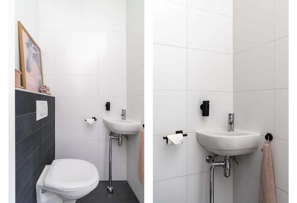 Via de overdekte entree kom je in de verzorgde hal met toegang tot meterkast, toilet, woonkamer en trapopgang naar boven. Alles is strak afgewerkt, er ligt een fraaie pvc-vloer met visgraat en bies die helemaal doorgelegd is naar keuken en woonkamer. Op de gehele begane grond ligt vloerverwarming en de wanden zijn allemaal glad gestukt. Het toilet is in neutrale grijs-witte kleurstelling en heeft een hangend closet en fonteintje.