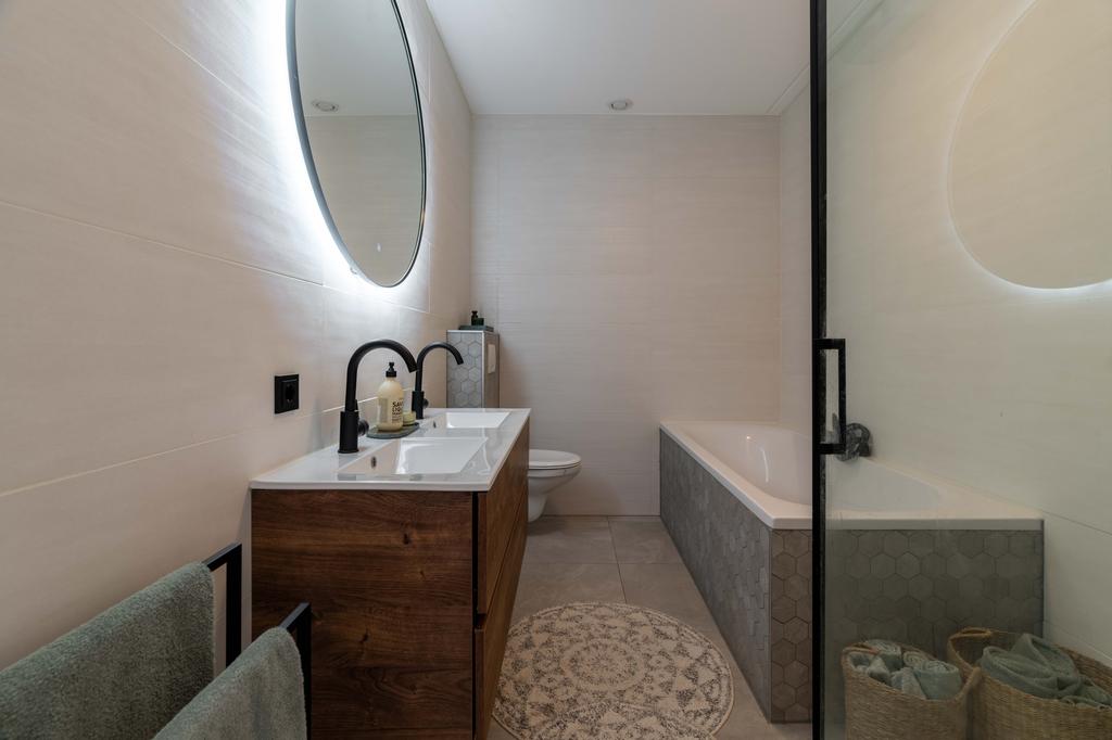 De badkamer (2023) is stijlvol en luxe. De lichtgrijs gemêleerde tegels zorgen voor een rustige, moderne basis, terwijl de zeshoekige tegeltjes bij het bad en toilet voor een fraai accent geven aan het geheel. De ruimte is compleet uitgerust met een royale inloopdouche, een ligbad, een toilet en een dubbele wastafel met strak ingezonken waskommen op een meubel in warme houtlook. Zwarte kranen en bijpassende zwarte accenten geven de badkamer een stoer en modern karakter.