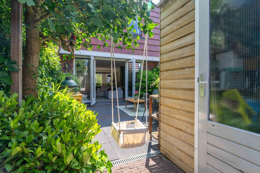 De achtertuin ligt op het westen, waardoor je hier lang kunt genieten van de zon. De tuin is opvallend breed van formaat en smaakvol aangelegd met grote grijze tegels in combinatie met charmante klinkertjes. Groenblijvende hagen en stijlvolle plantenbakken zorgen voor een groene en sfeervolle uitstraling. Achter in de tuin bevindt zich een praktische houten berging, ideaal voor het stallen van fietsen en het opbergen van tuinspullen.