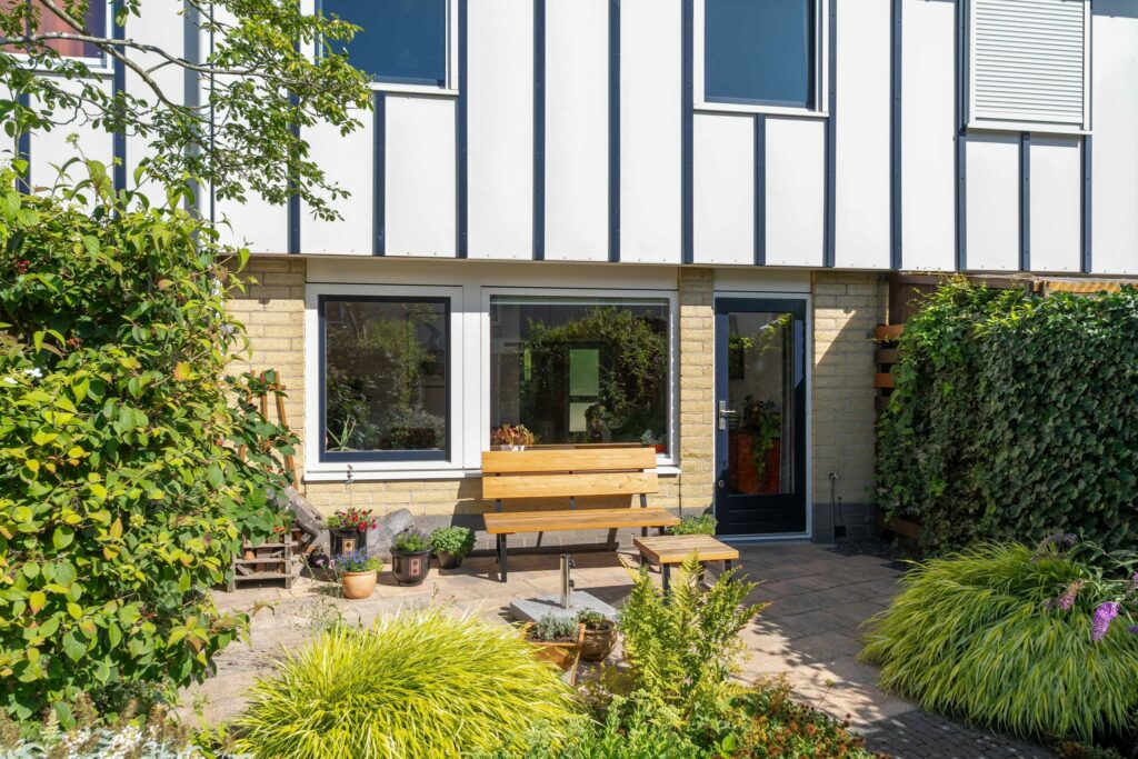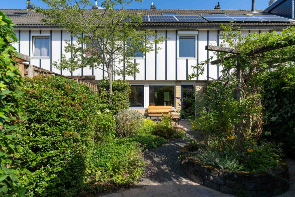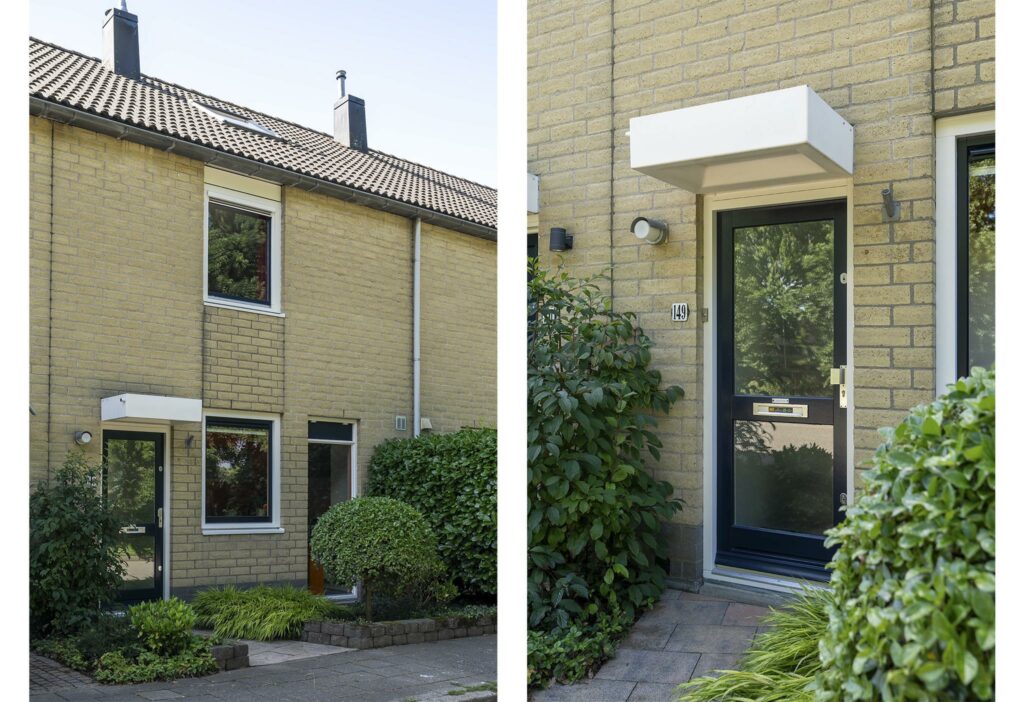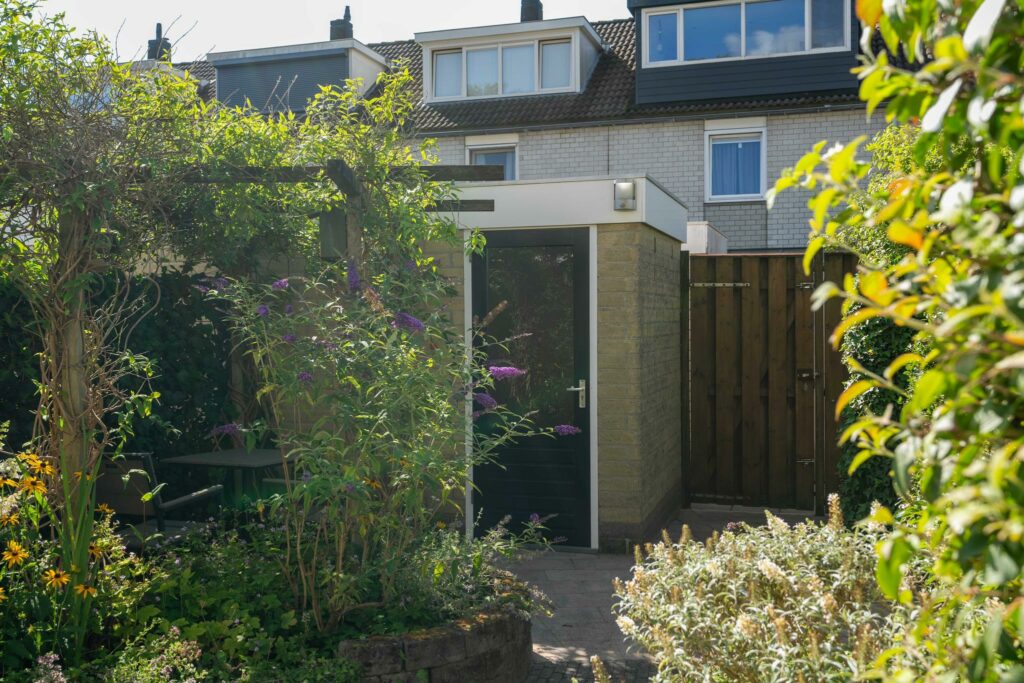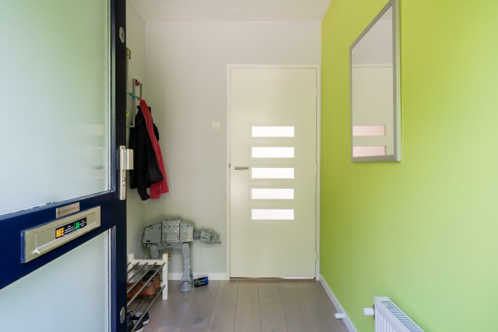 De voortuin is lekker groen gehouden, een fijn welkom. Via de voortuin kom je bij de entree. De overdekte entree brengt je in de hal die toegang geeft tot de woonkamer.