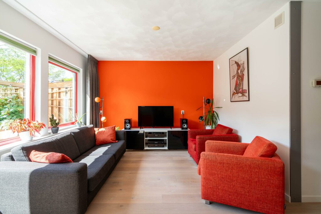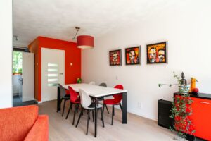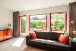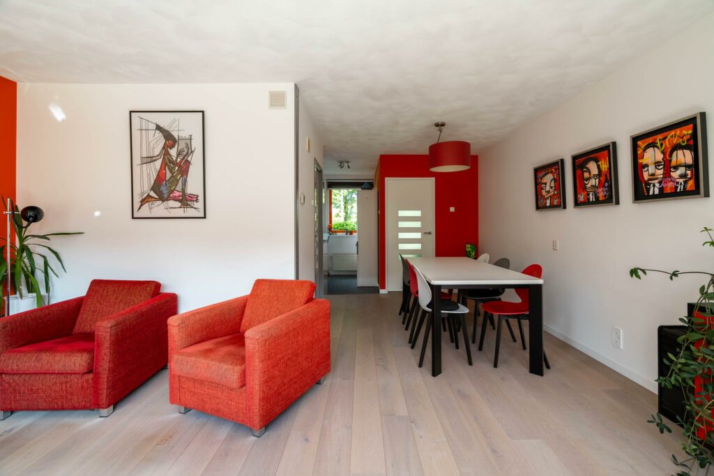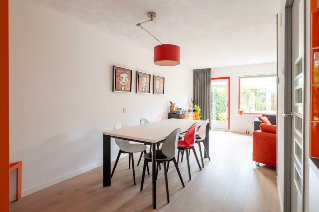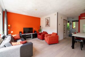 De keuken staat in directe verbinding met de woonkamer aan de achterzijde van het huis. Hier is genoeg ruimte voor een ruime eettafel en een zithoek. Op de vloer ligt een mooi eikenhouten parket. Door de grote raampartij is de woonkamer heerlijk licht en de loopdeur zorgt voor een directe verbinding met de tuin.
