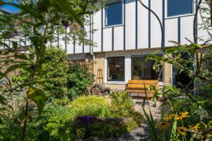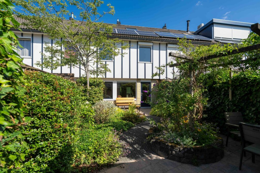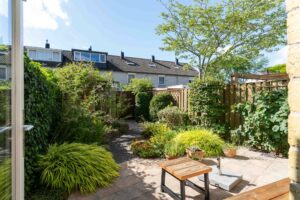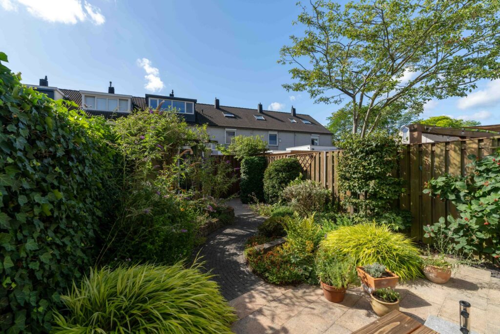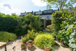 De achtertuin is groen aangelegd met gezellige bestrating en mooie borders met planten. Met de ligging op het zuidoosten is het hier volop genieten van de zon. Een heerlijke plek! Achterop het perceel staat een stenen berging met voldoende ruimte voor (tuin)gereedschap en fietsen.