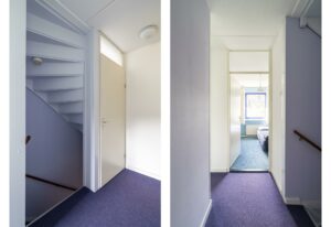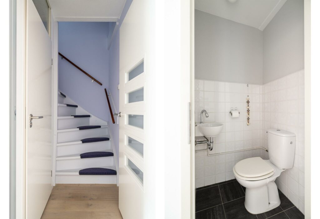 In de tussenhal vind je het toilet in neutrale kleurstelling met fonteintje. Hier is ook de trapopgang naar de eerste verdieping.