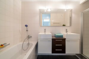 De badkamer in neutrale kleurstelling heeft de beschikking over een heerlijk ligbad, een dubbele wastafel, zwevend toilet en een douchecabine.