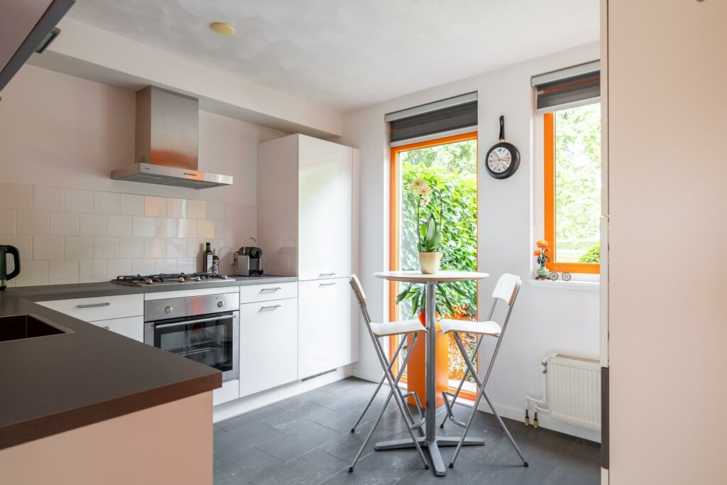 Vanuit de hal kom je in de woonkamer en keuken. De keuken met kurkvloer bevindt zich aan de voorzijde van het huis en is in hoekopstelling geplaatst in neutrale kleurstelling met witte frontjes en een donkergrijs werkblad. De keuken beschikt over een inbouwoven, 4-pits gaskookplaat, een vaatwasser en een koelvriescombinatie. Leuk detail is het grote raam aan voorzijde waardoor je lekker uitkijkt op het groen.