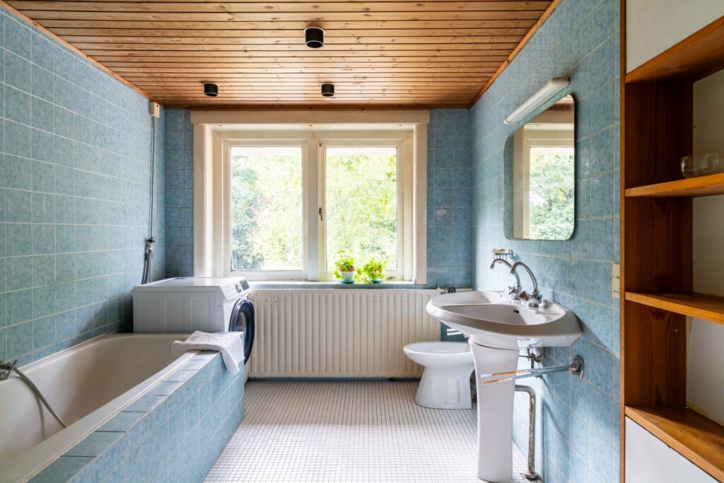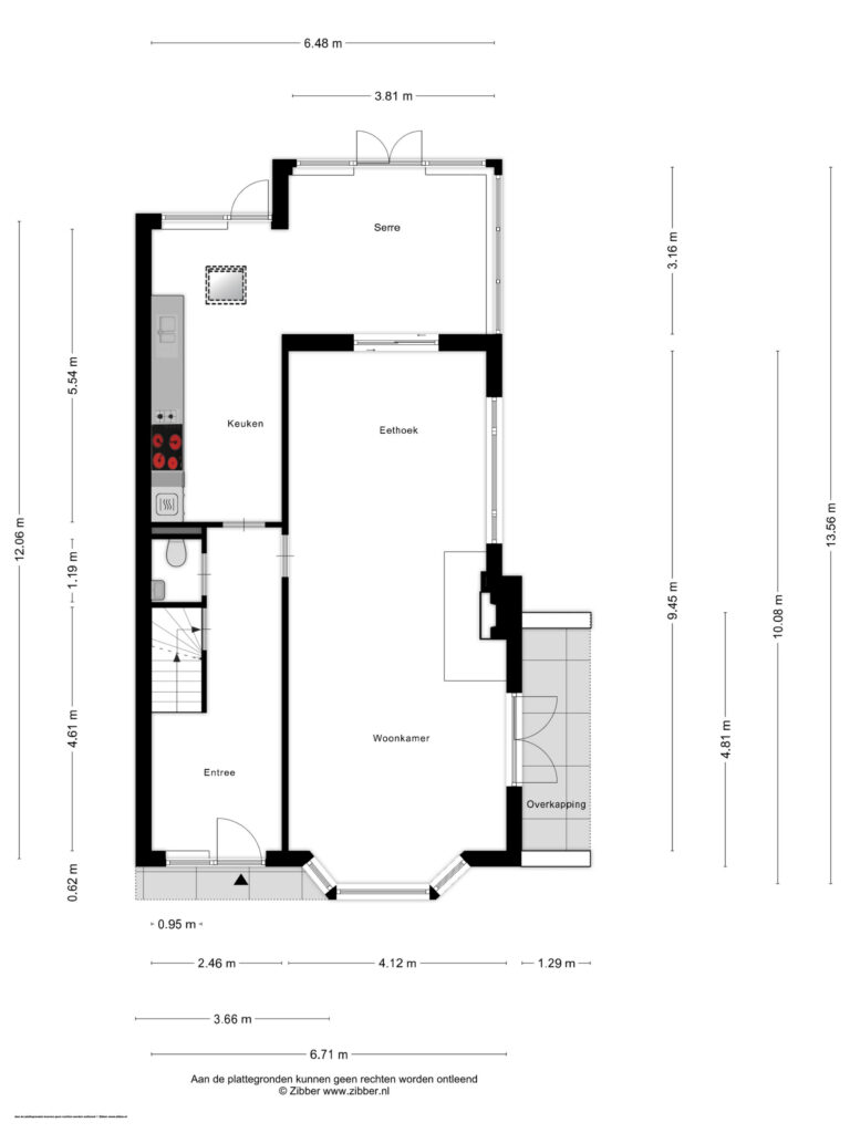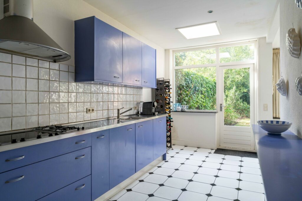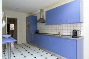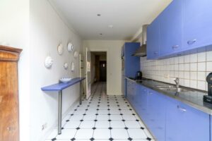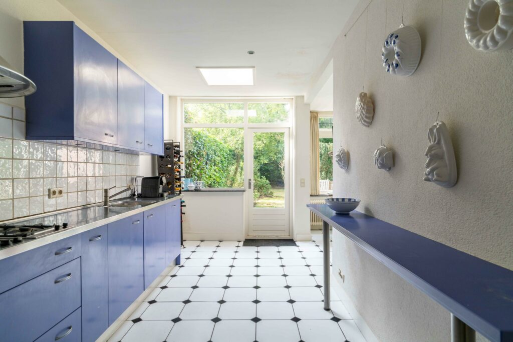 De halfopen keuken is aan de achterzijde uitgebouwd waardoor een ruime opzet van ca. 14 m² ontstaat direct verbonden met de originele uitbouw aan de achterzijde. Voldoende plek om een knusse eethoek te plaatsen. De keuken is in de lengte opgesteld en voorzien van diverse inbouwapparatuur waaronder een koelkast, vaatwasser, oven en 6-pits kookplaat. De dakkoepel laat extra veel daglicht binnenvallen terwijl een loopdeur naar de tuin zorgt voor een directe verbinding met buiten.