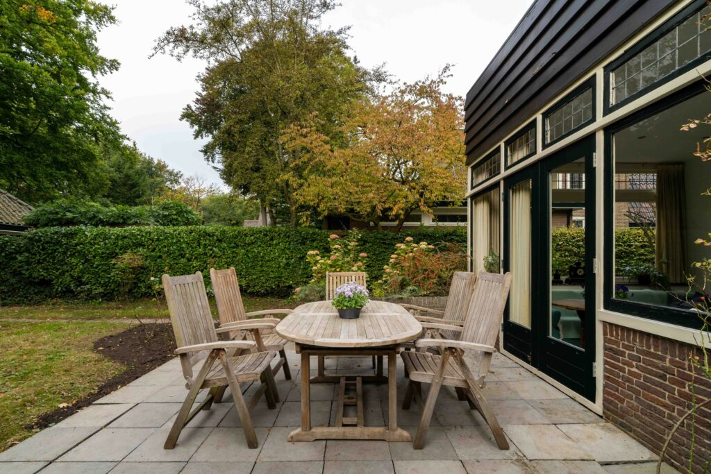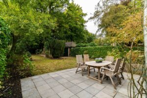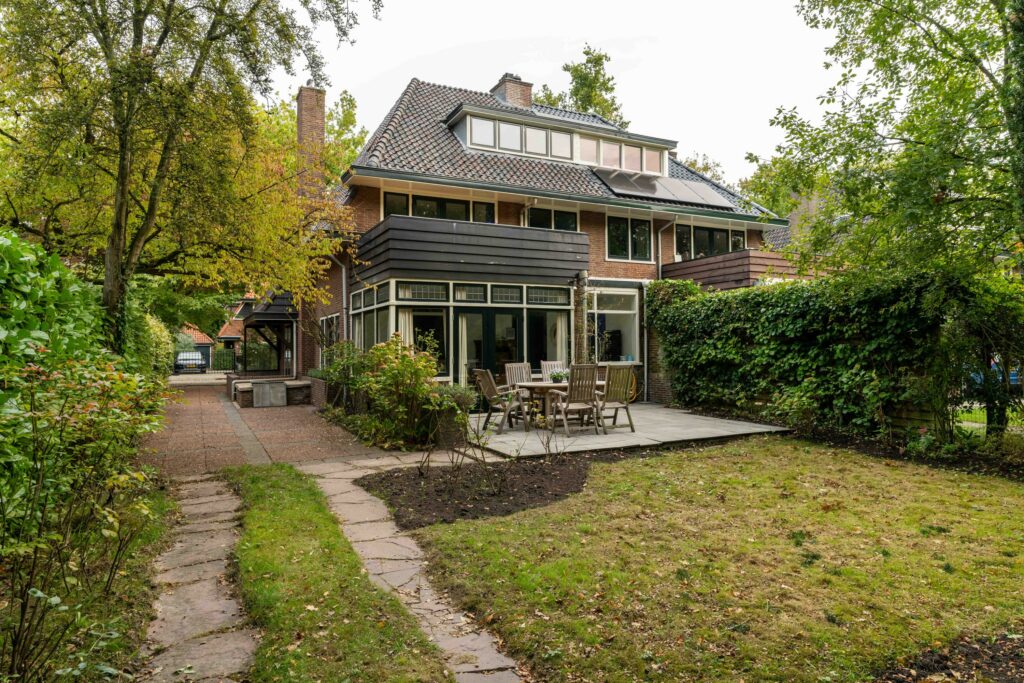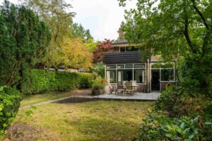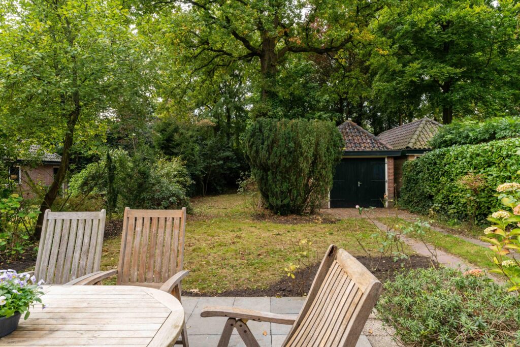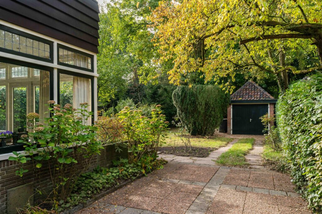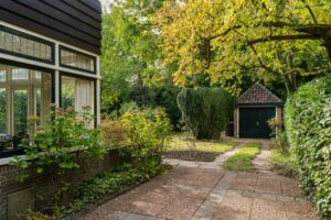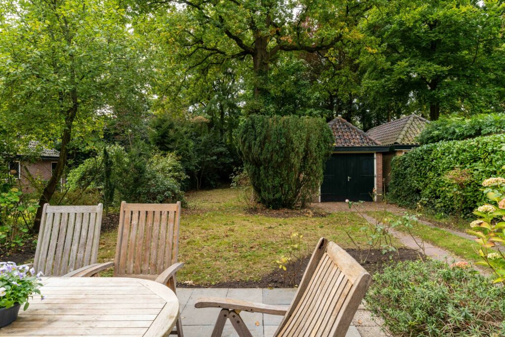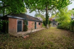 De achtertuin, gelegen op het zuidwesten, is zeer diep en biedt daarmee veel mogelijkheden. Direct aan de achtergevel ligt een groot terras, daarnaast is er volop ruimte voor een extra terras, speeltoestellen of bijvoorbeeld een klein hockeyveldje. Achter in de tuin zorgen veel grote, oude bomen voor extra privacy en een groene, natuurlijke sfeer. Hier vind je een vrijstaande garage van ca. 24 m², die groot genoeg is om een auto te parkeren en daarnaast nog voldoende ruimte biedt voor een werkbank of andere hobby- en opbergmogelijkheden. Aan de achterzijde van de garage grenst bovendien nog een aparte berging. Aan de zijkant van het huis is tenslotte de stookruimte toegankelijk die ca. 11 m² groot is en extra bergruimte biedt.