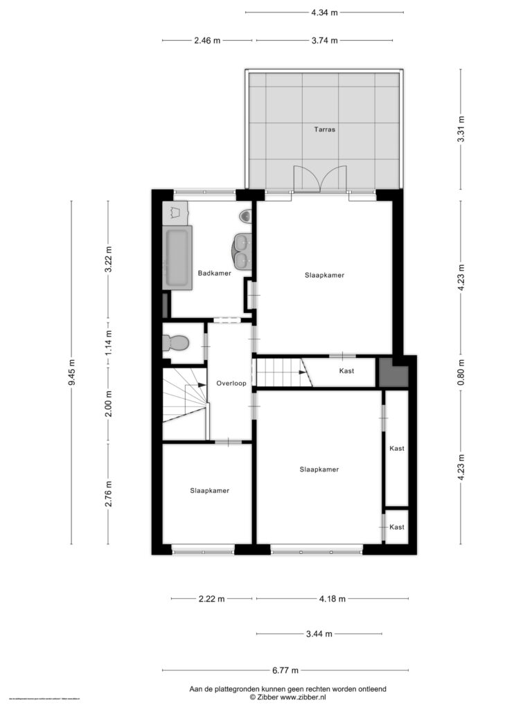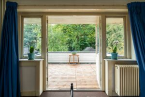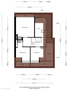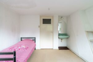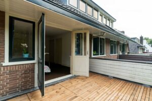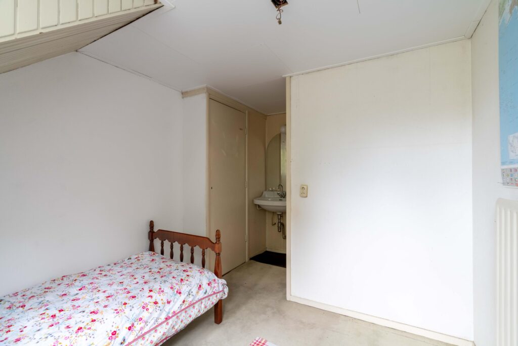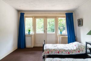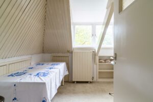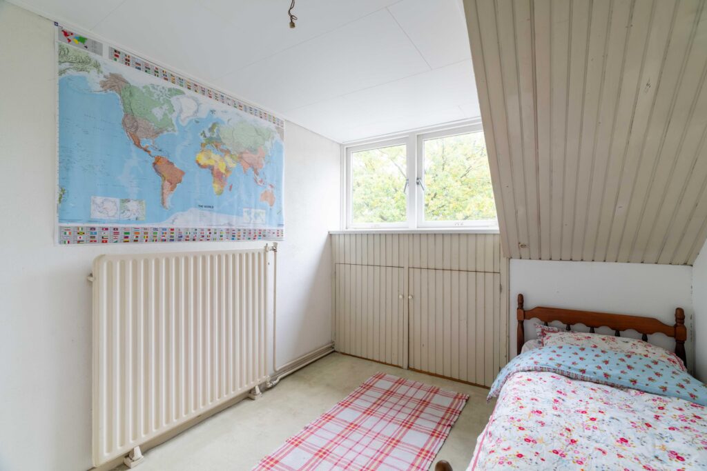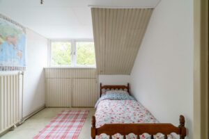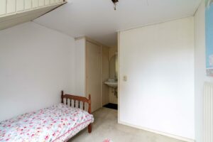 Aan de achterzijde ligt de derde slaapkamer eveneens ruim met ca. 18 m² oppervlak. Deze kamer heeft openslaande deuren naar het grote dakterras van ca. 12 m² dat een aangenaam groen uitzicht biedt over de tuin.