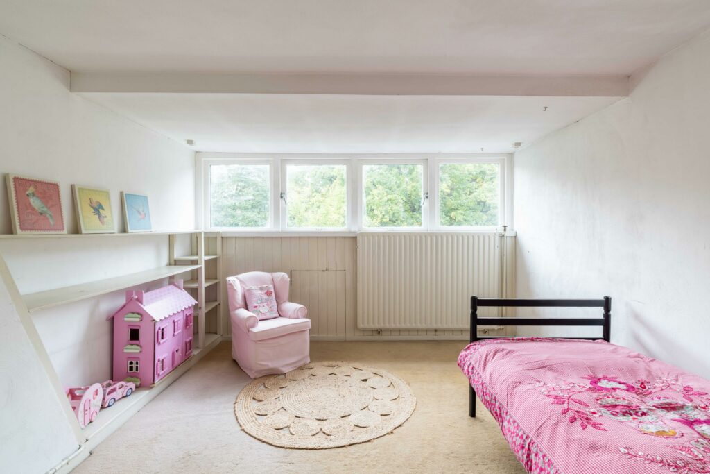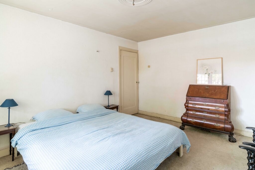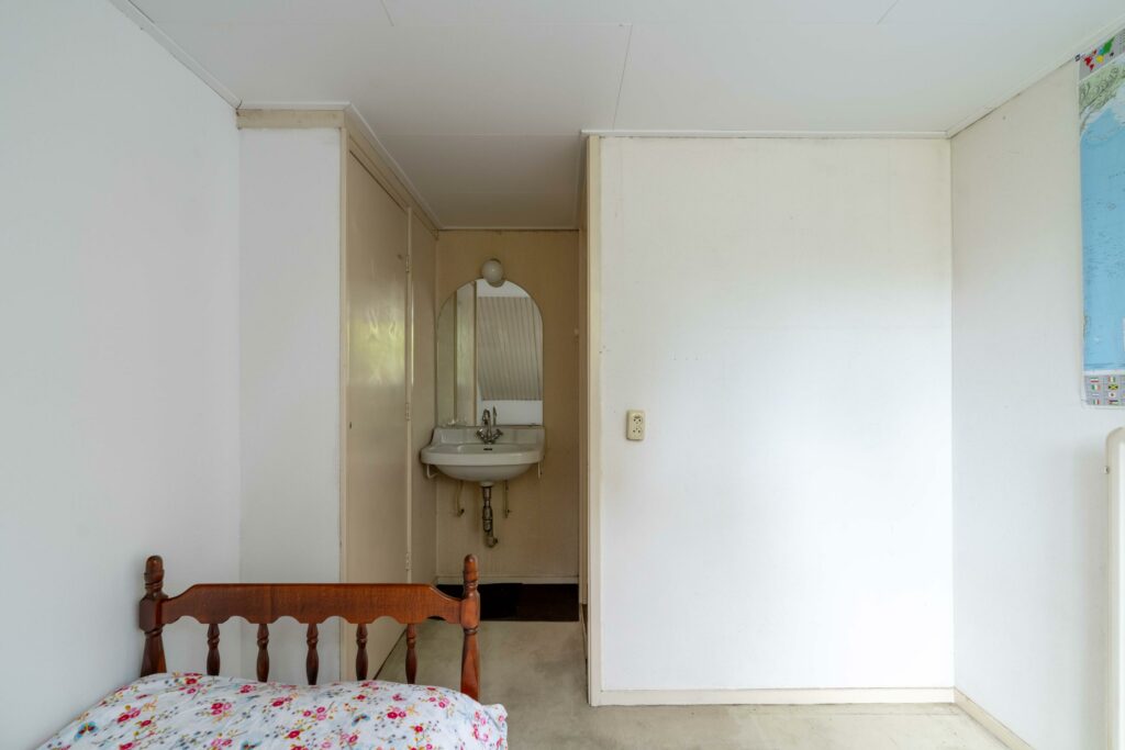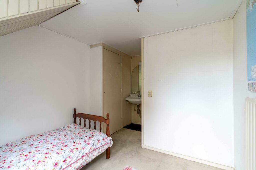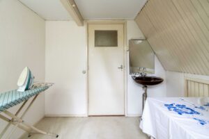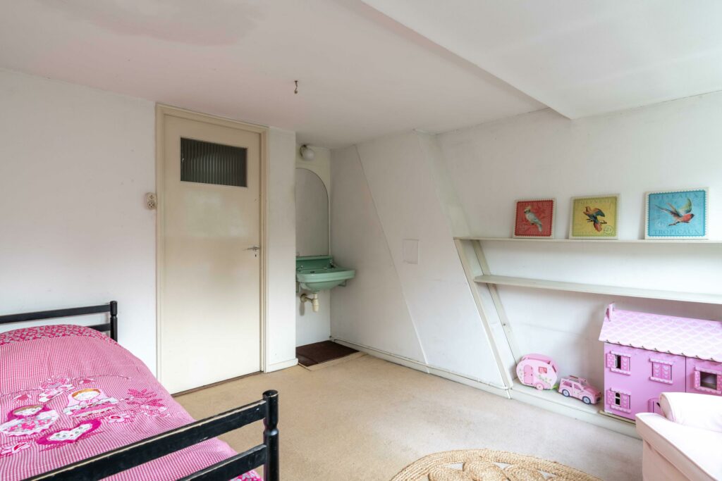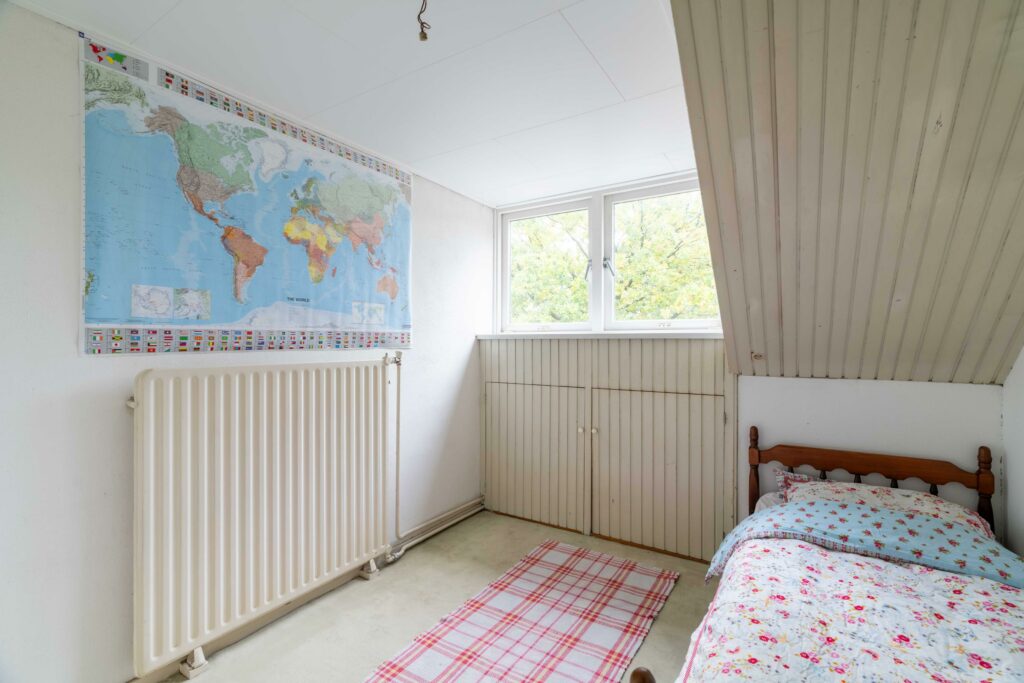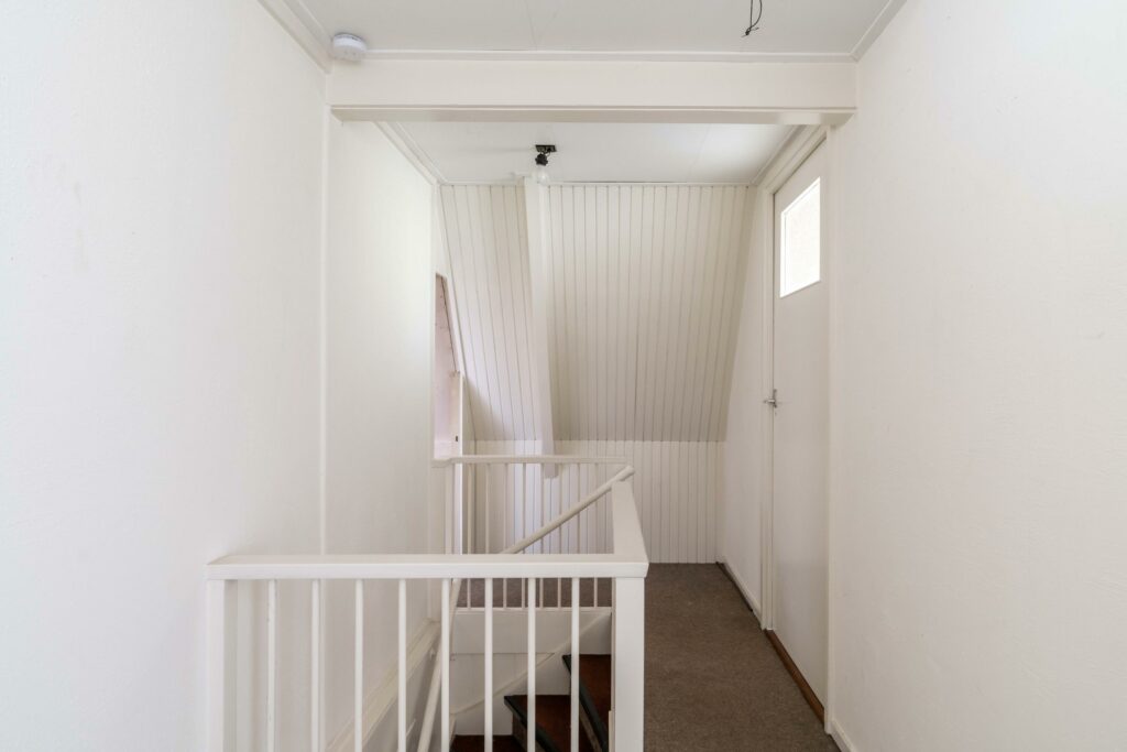 Een vaste trap leidt naar de tweede verdieping waar een ruime overloop toegang biedt tot drie slaapkamers en een bergruimte. De slaapkamers zijn allemaal voorzien van een eigen wastafel. Op deze verdieping is genoeg ruimte om een tweede badkamer te realiseren, ideaal voor kinderen of logees. Vanuit de overloop geeft een vlizotrap toegang tot de vliering die extra bergruimte biedt en de veelzijdigheid van deze verdieping compleet maakt.