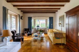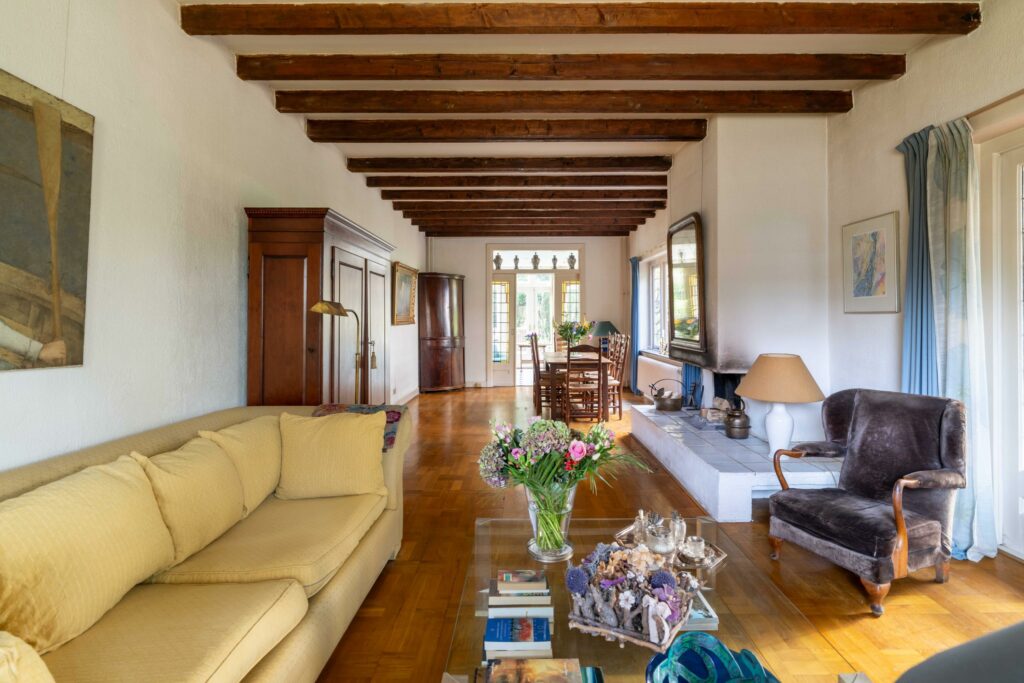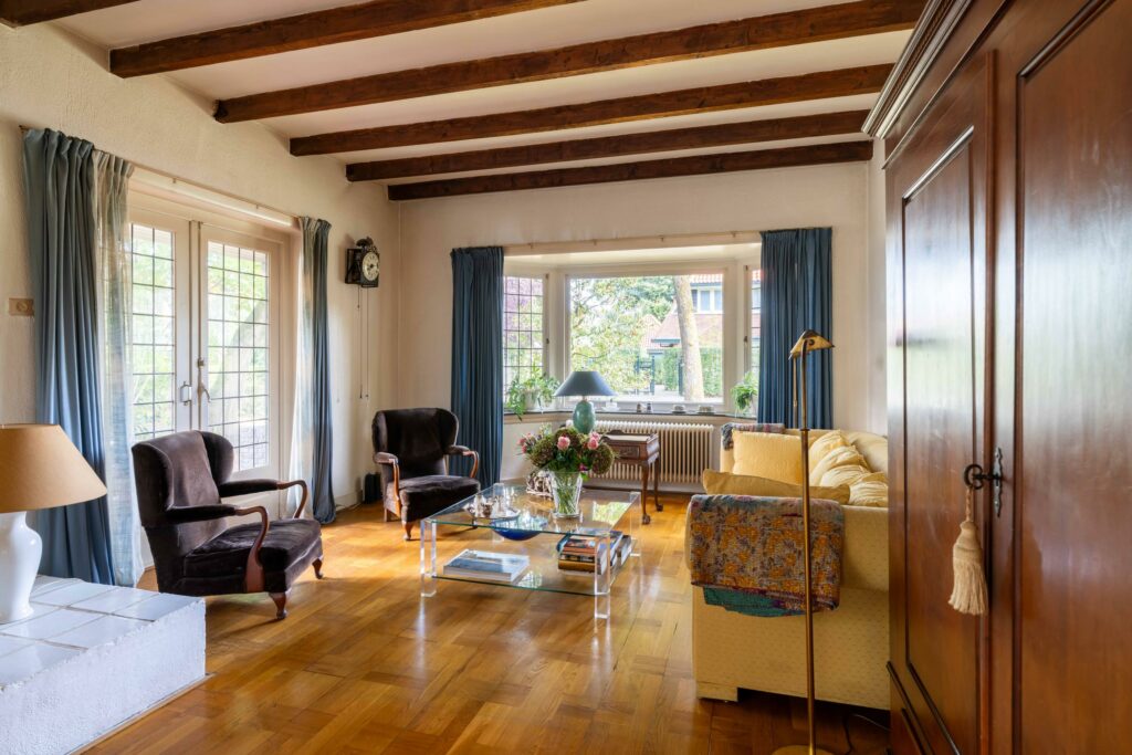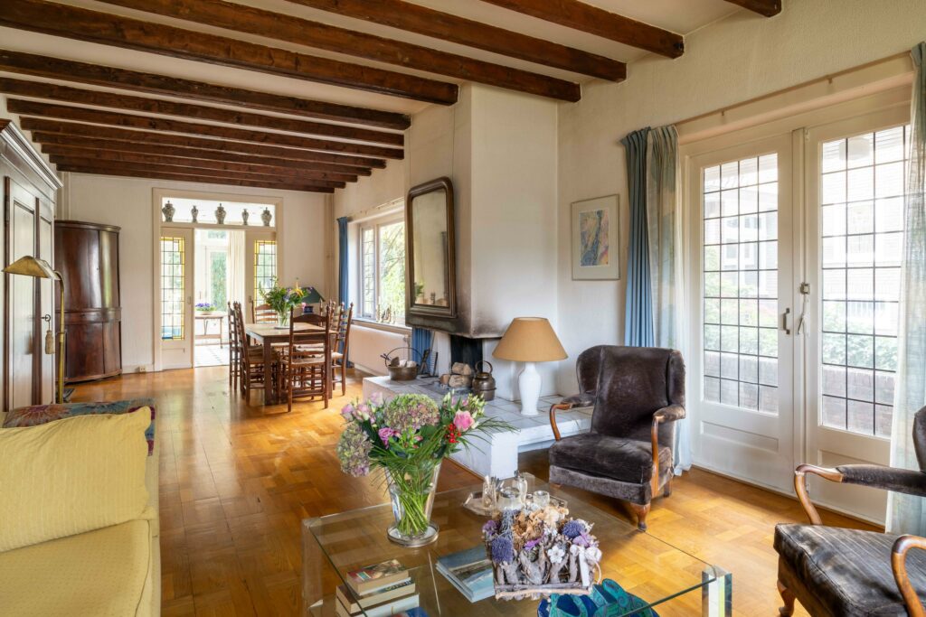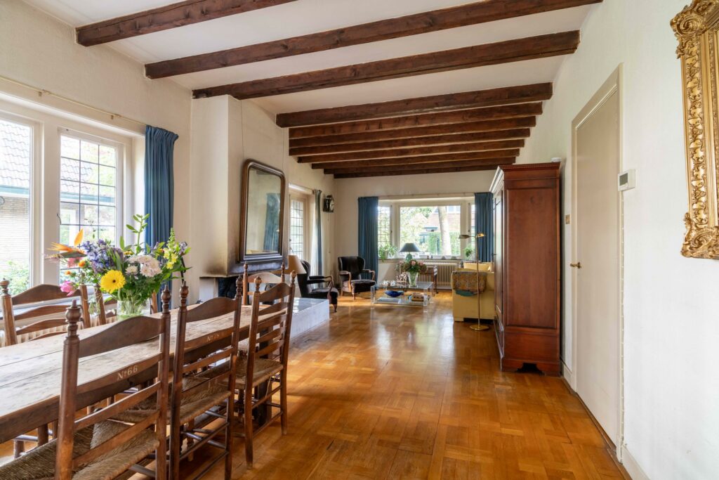 originele balkenplafond geven de ruimte een warme en karaktervolle uitstraling.