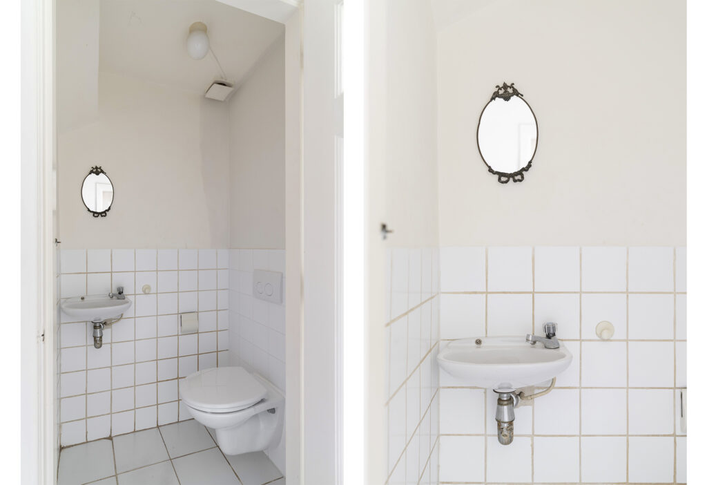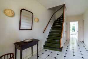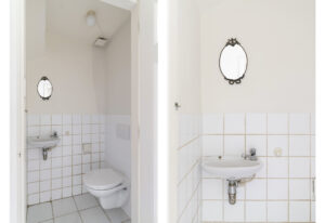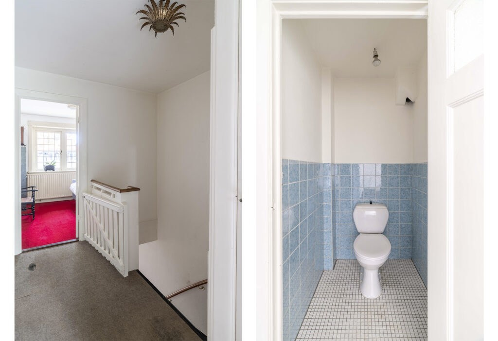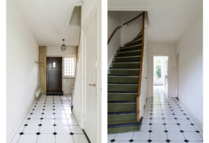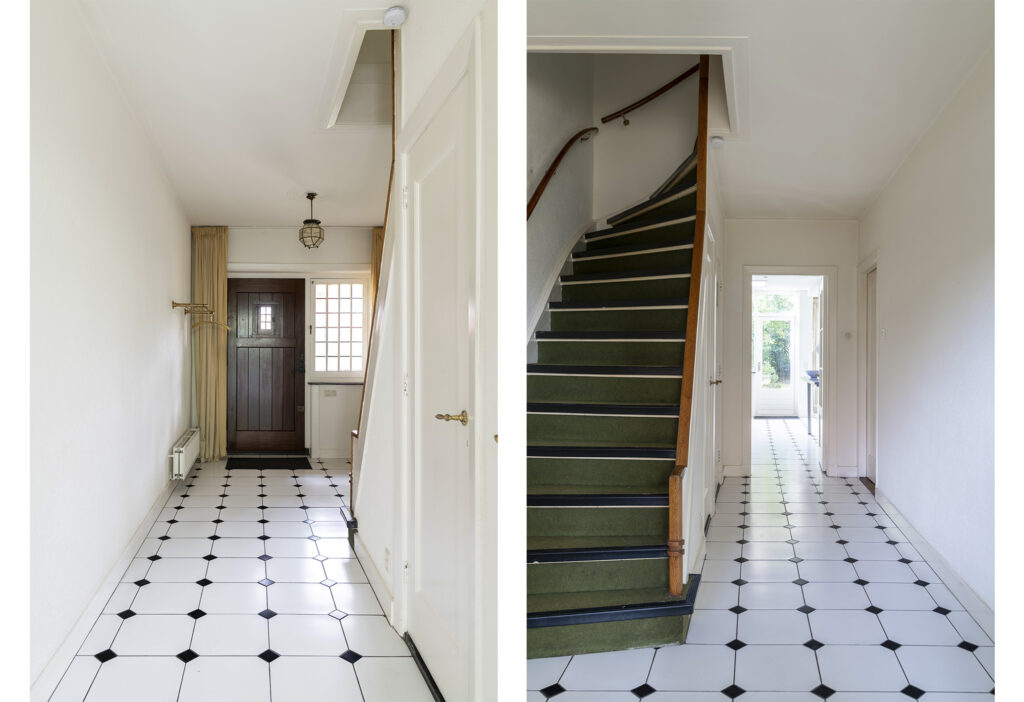 Via de entree aan de voorzijde betreed je de ruime hal die direct de sfeer van een karakteristieke jaren ’30-woning uitstraalt. De klassieke voordeur met zijvensters zorgt voor een mooie lichtinval, waardoor de ruimte een open en uitnodigende uitstraling heeft. De bijzonder brede hal biedt toegang tot zowel de keuken als de woonkamer en beschikt over een toiletruimte, toegang tot de kelder en een stijlvolle trapopgang naar de eerste verdieping.