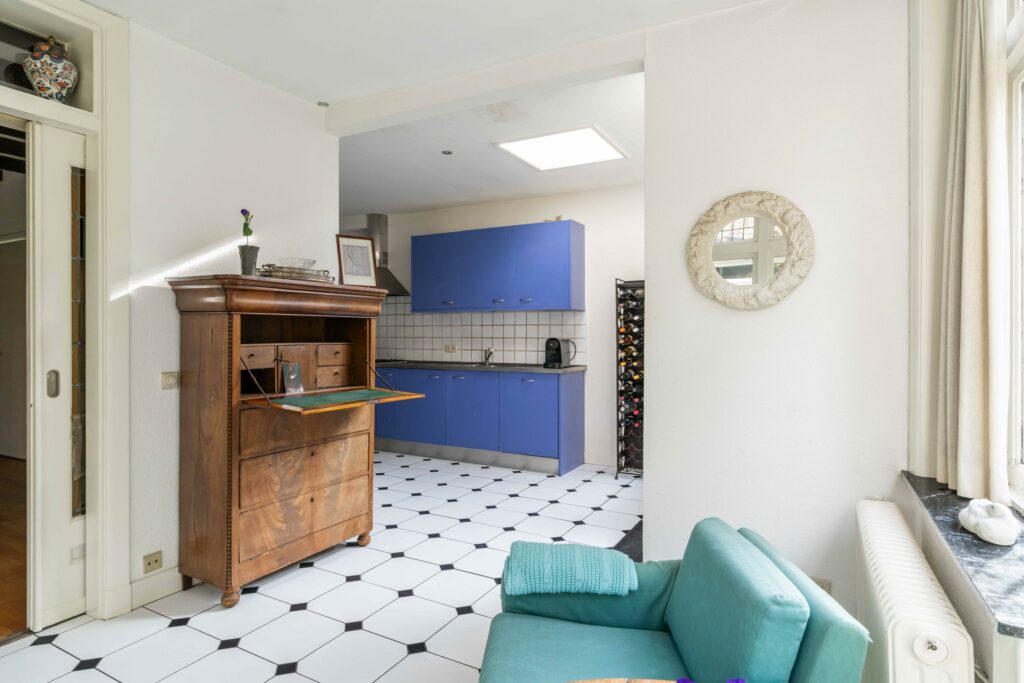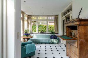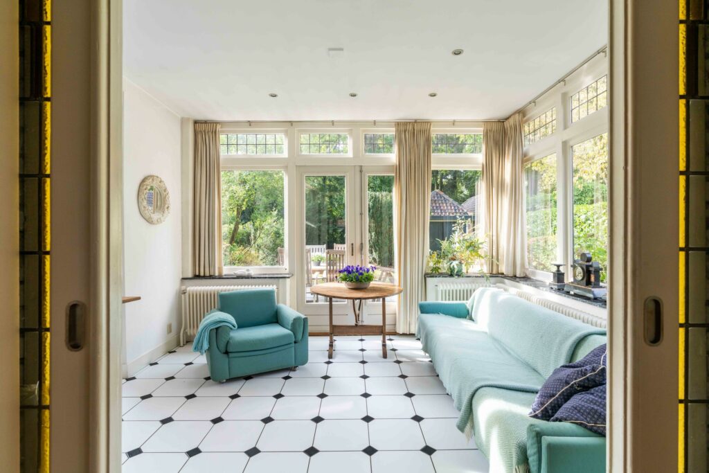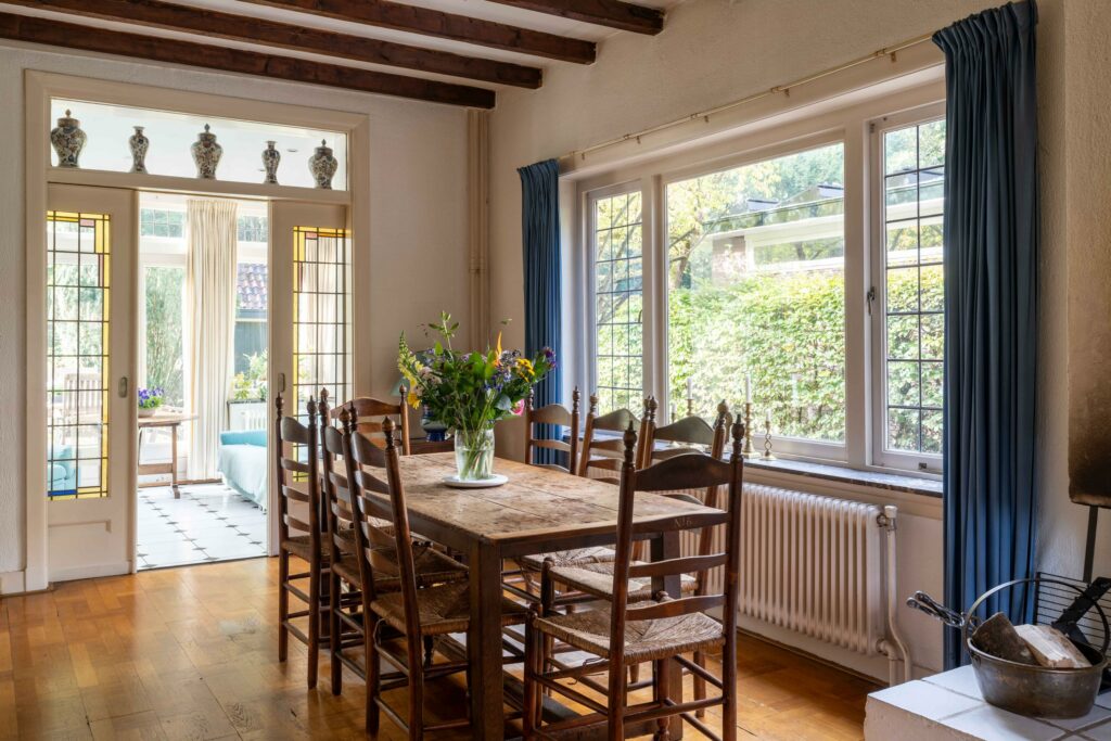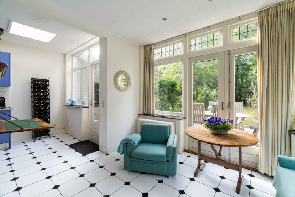 Aan de achterzijde bevindt zich de originele uitbouw van de woning die door de authentieke en-suite deuren met glas-in-lood en bovenlicht verbonden is met de rest van de leefruimte. De raampartijen rondom en de openslaande deuren naar de tuin maken dit tot een lichte, sfeervolle plek waar binnen en buiten naadloos in elkaar overlopen. Een prachtige plek om een eetkamer te realiseren.