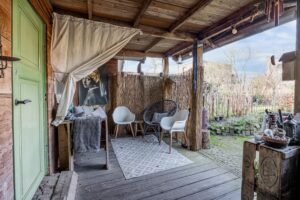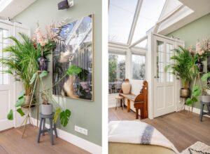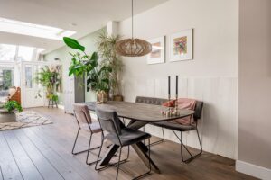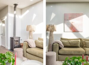 Aan de achterzijde van de woning ligt het ruime leef- en zitgedeelte dat dankzij de twee lichtstraten bijzonder licht en uitnodigend is. De ruimte biedt volop plek voor een comfortabele zithoek en een ruime eethoek, met aan de zijde van de keuken ruimte voor een lange eettafel. De woonkamer straalt warmte en sfeer uit door de houtkachel, de massief houten vloerdelen en de strak gestuukte wanden. Openslaande deuren zorgen voor een natuurlijke verbinding met de tuin terwijl het achter-portaal en de berging met kelder het geheel praktisch en comfortabel maken.