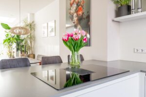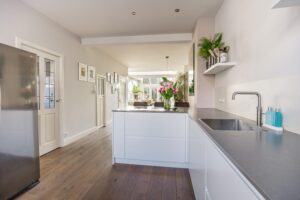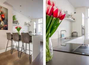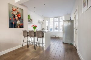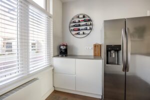 Aan de voorzijde van de woning bevindt zich de ruime, moderne keuken (2021) in een praktische opstelling met vrij uitzicht over de Bekensteinselaan. Bij het gezellige barretje van de keuken heb je een van de fijnste plekjes van het huis voor je ochtendkoffie of een glas wijn in de avond. De keuken is uitgevoerd in een tijdloze witte kleur, gecombineerd met een donkergrijs composiet werkblad en is volledig uitgerust met diverse moderne inbouwapparatuur: inductiekookplaat met afzuigsysteem, combi-oven, en vaatwasser aangevuld met een Amerikaanse losse koelkast. Alles verkeert in uitstekende staat.