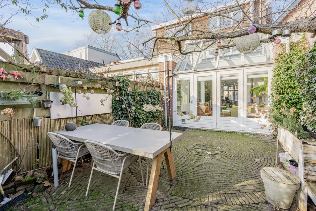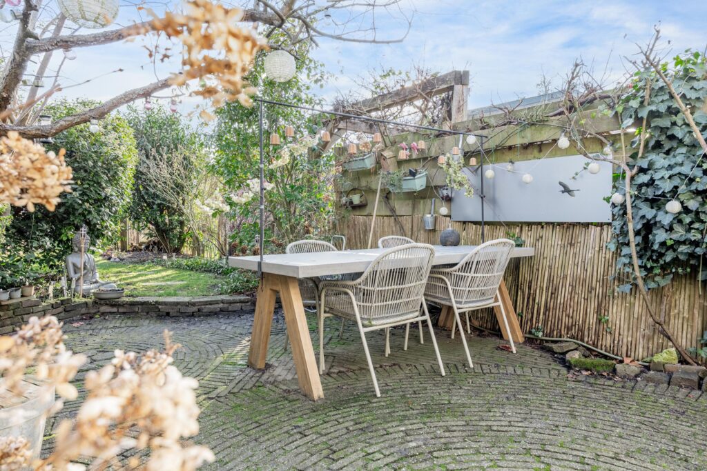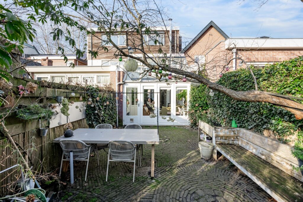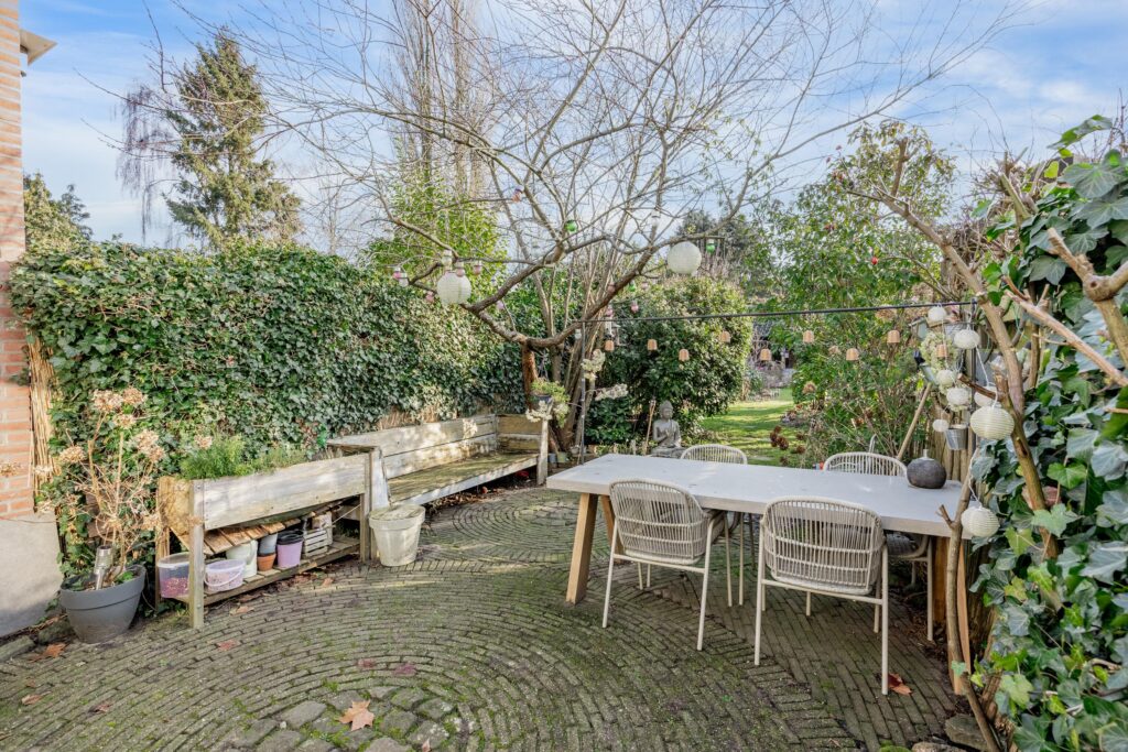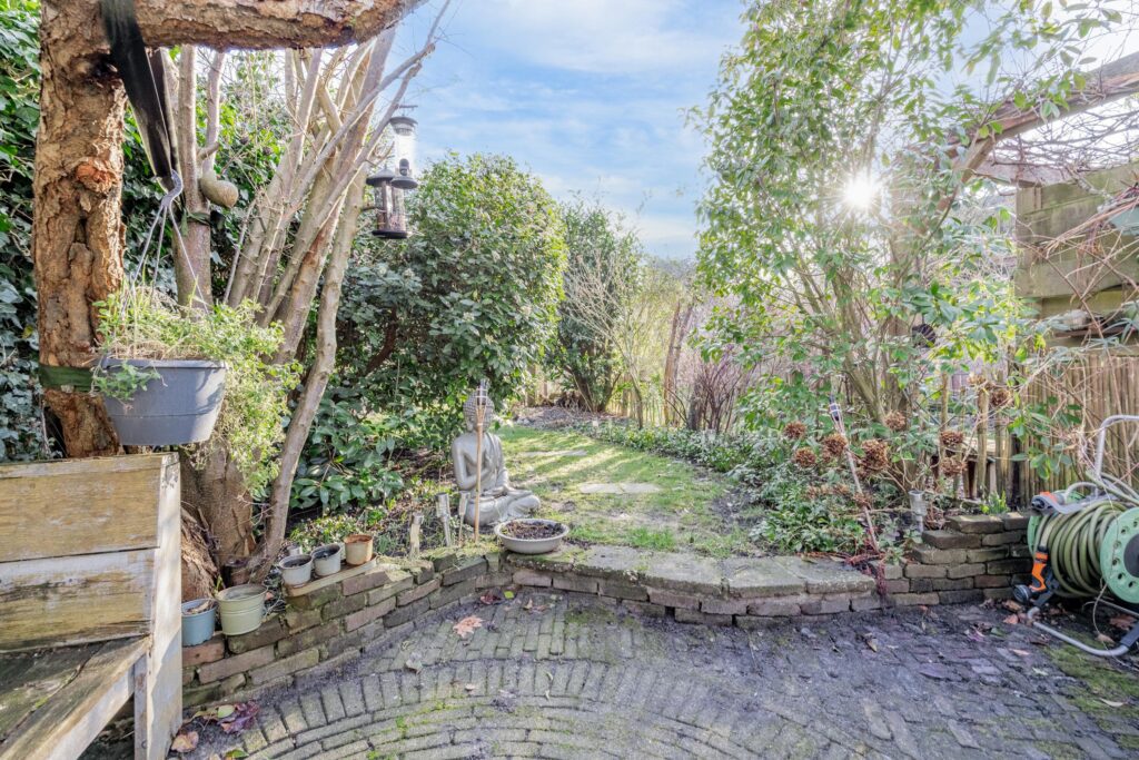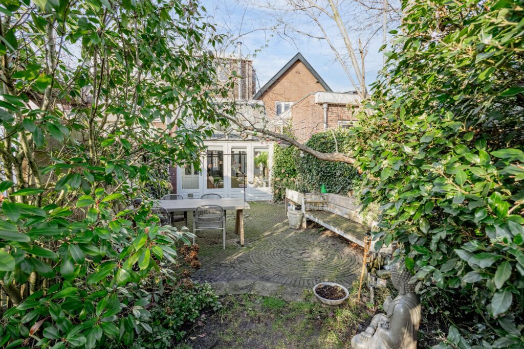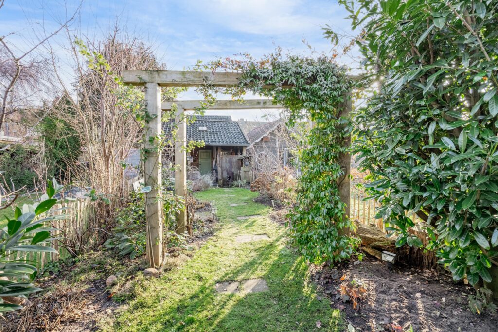 De ca. 30 meter diepe achtertuin op het zuiden is een absoluut pluspunt van de woning: zonnig, groen en veelzijdig. Direct achter de gevel ligt het eerste gezellige terras, perfect om te genieten van de zon. De tuin is voorzien van diverse fruitbomen en fraaie borders wat zorgt voor een weelderige en sfeervolle groene omgeving. Achterin staat een ruime berging met gezellige overkapping die beschikt over een praktische werkruimte, een ruime zolder en een achterom. Hierdoor biedt de tuin niet alleen een heerlijke buitenplek, maar ook volop mogelijkheden voor ontspanning, hobby of opslag.